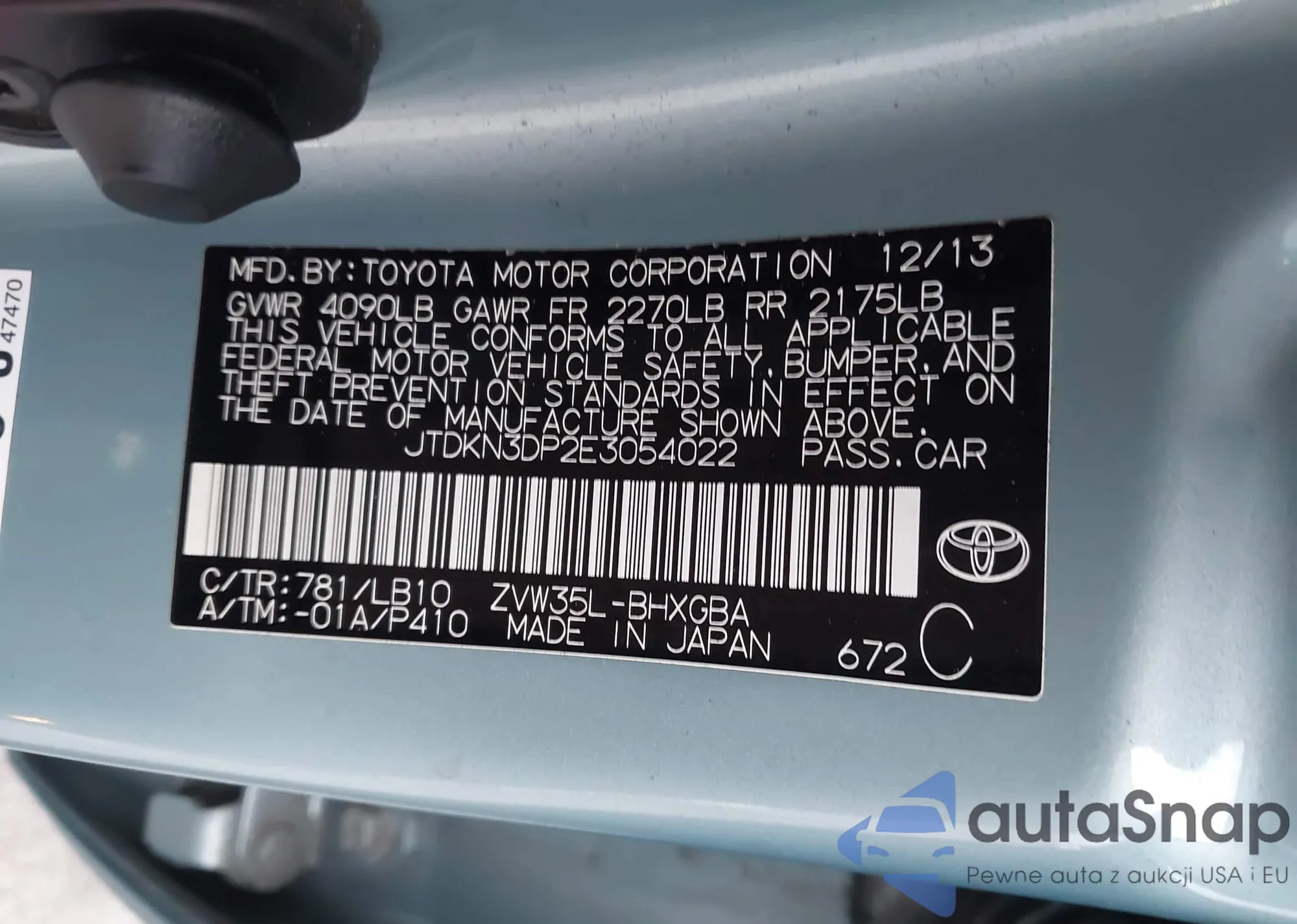 Samochód Toyota Prius 2014 (VIN JTDKN3DP2E3054022) nie był wcześniej licytowany. Dokumenty są czyste, przebieg odpowiada lub jest niższy niż średnia rynku. Sprzedaje go firma ubezpieczeniowa – polecamy zakup. Dostawa do portu zajmie ok. 6–8 tygodni.