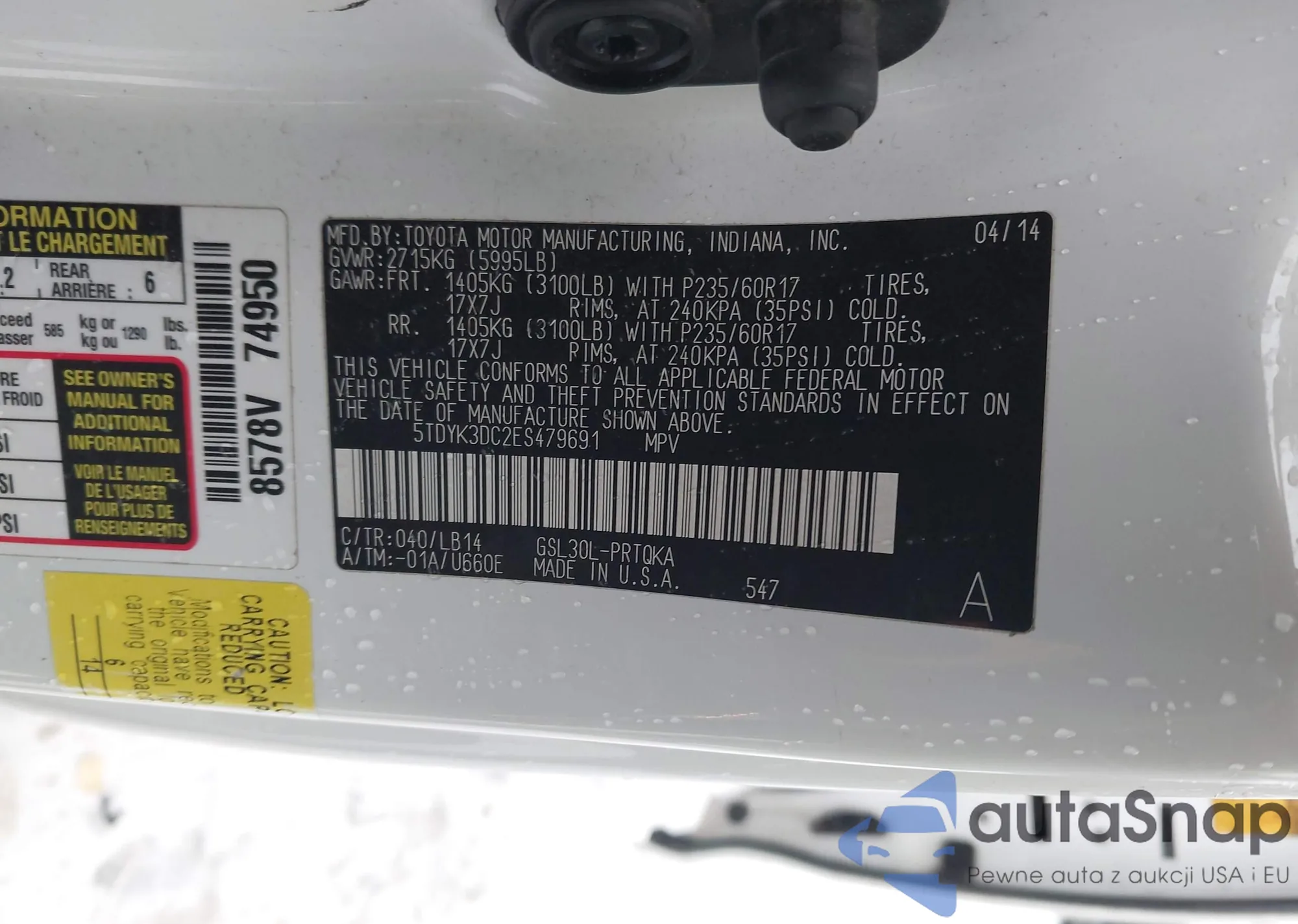 Samochód Toyota Sienna 2014 (VIN 5TDYK3DC2ES479691) nie był wcześniej licytowany. Dokumenty są czyste, przebieg odpowiada lub jest niższy niż średnia rynku. Sprzedaje go firma ubezpieczeniowa – polecamy zakup. Dostawa do portu zajmie ok. 6–8 tygodni.
