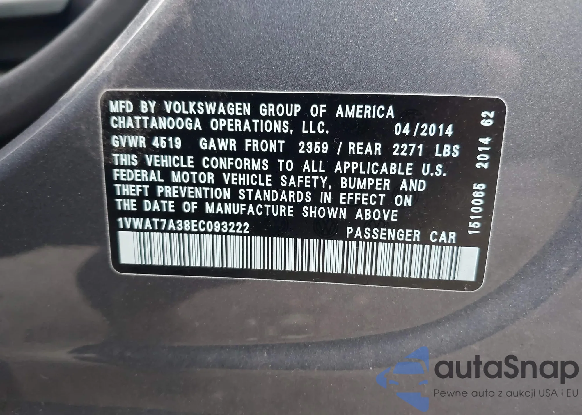 Samochód Volkswagen Passat 2014 (VIN 1VWAT7A38EC093222) ma dokumenty uniemożliwiające rejestrację. Mogą pojawić się trudności przy eksporcie i rejestracji. Skontaktuj się z ekspertami AutaSnap w celu znalezienia alternatywy.