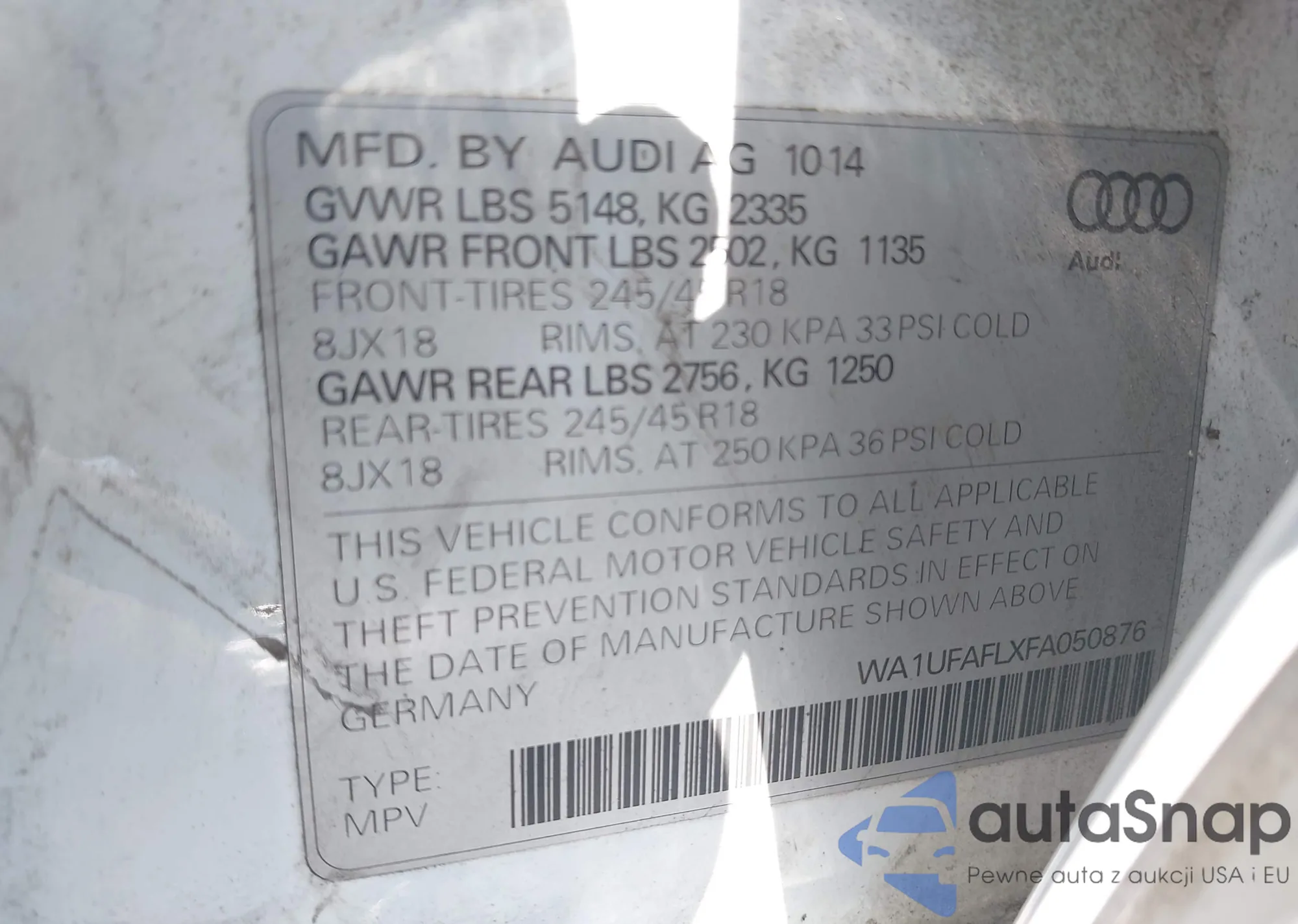 Samochód Audi Allroad 2015 (VIN WA1UFAFLXFA050876) nie był wcześniej licytowany. Dokumenty są czyste, przebieg odpowiada lub jest niższy niż średnia rynku. Sprzedaje go firma ubezpieczeniowa – polecamy zakup. Dostawa do portu zajmie ok. 6–8 tygodni.