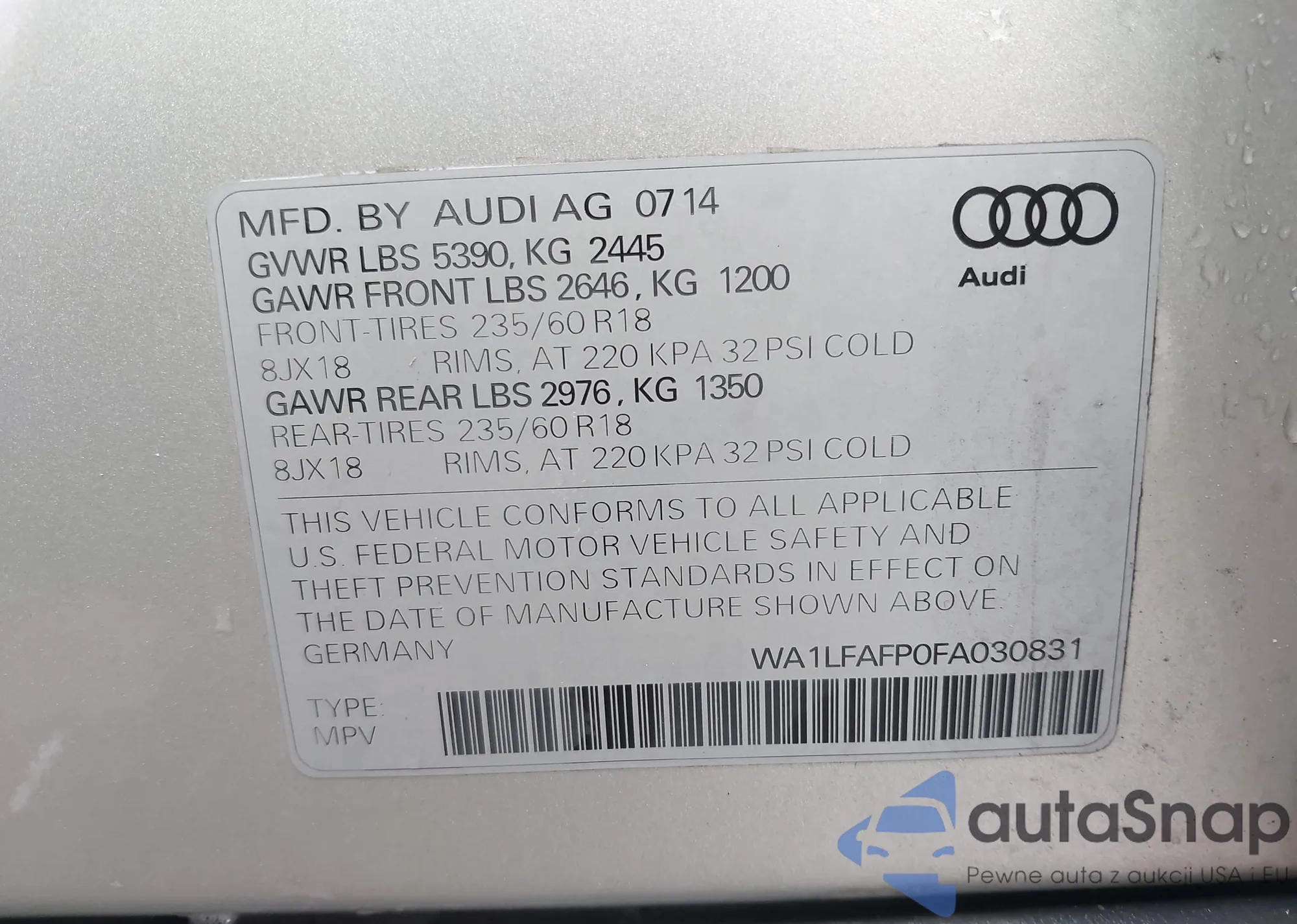 Samochód Audi Q5 2015 (VIN WA1LFAFP0FA030831) nie był wcześniej licytowany. Dokumenty są czyste, przebieg odpowiada lub jest niższy niż średnia rynku. Sprzedaje go firma ubezpieczeniowa – polecamy zakup. Dostawa do portu zajmie ok. 6–8 tygodni.
