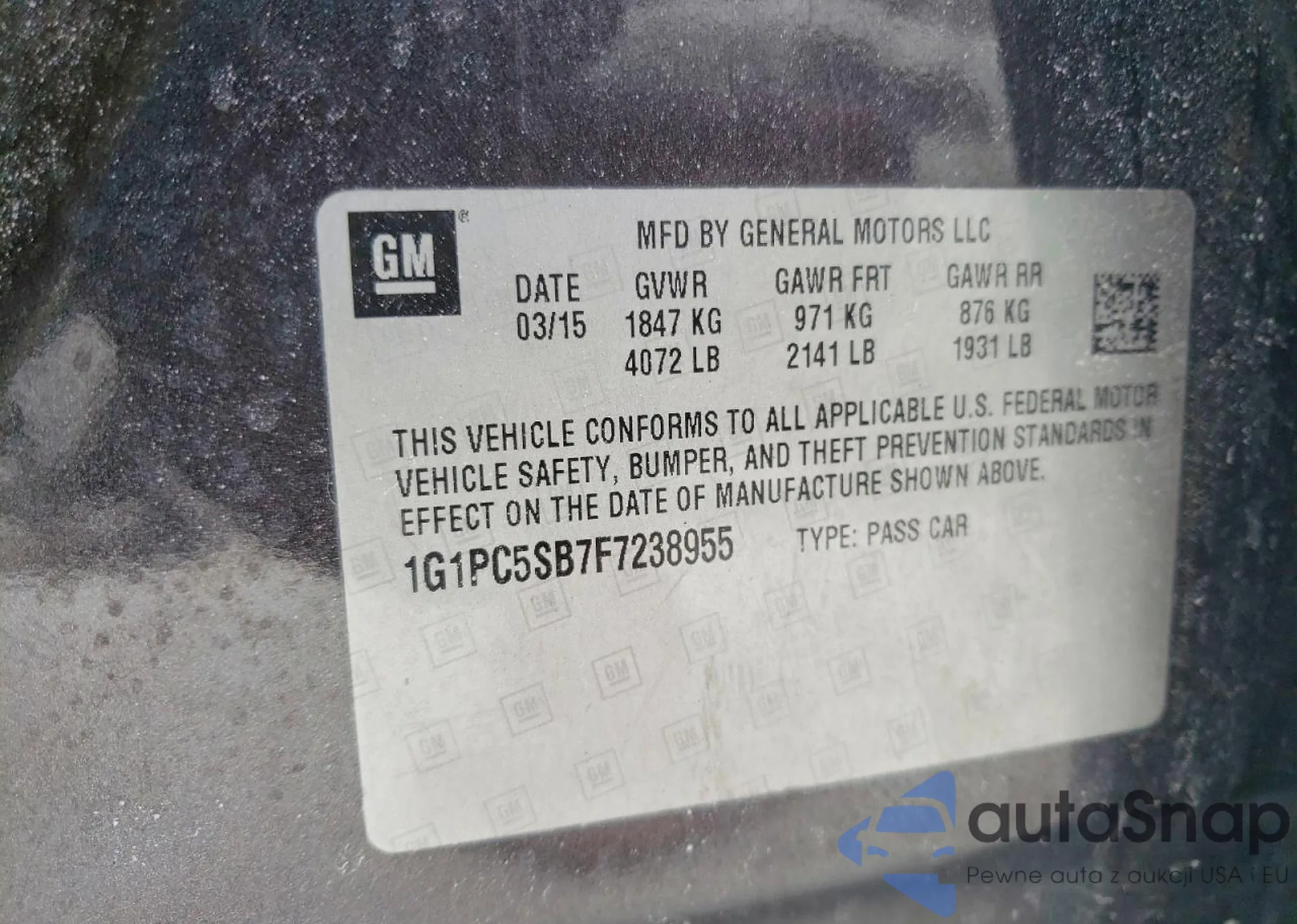 Samochód Chevrolet Cruze 2015 (VIN 1G1PC5SB7F7238955) nie był wcześniej licytowany. Dokumenty są czyste, przebieg odpowiada lub jest niższy niż średnia rynku. Sprzedaje go firma ubezpieczeniowa – polecamy zakup. Dostawa do portu zajmie ok. 6–8 tygodni.
