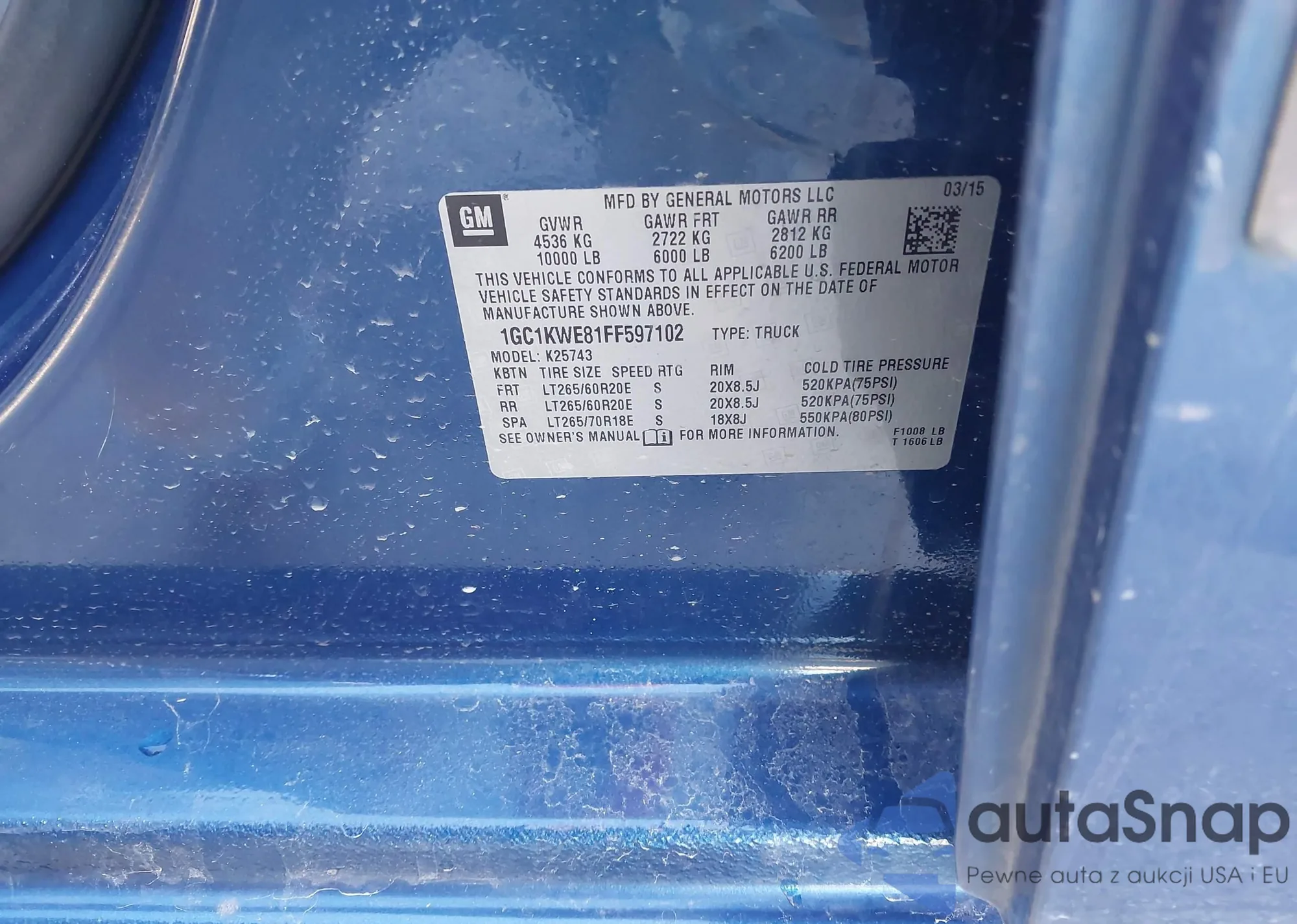 Samochód Chevrolet Silverado 2015 (VIN 1GC1KWE81FF597102) nie był wcześniej licytowany. Dokumenty są czyste, przebieg odpowiada lub jest niższy niż średnia rynku. Sprzedaje go firma ubezpieczeniowa – polecamy zakup. Dostawa do portu zajmie ok. 6–8 tygodni.