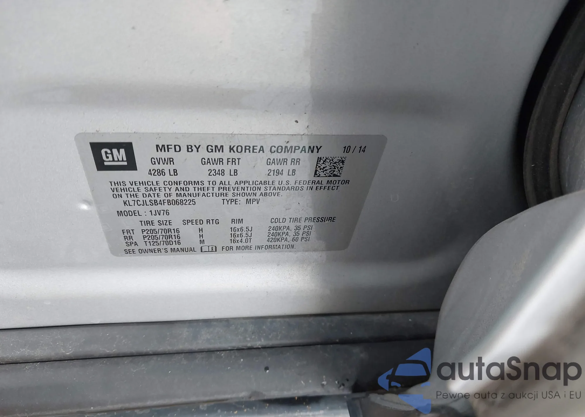 • VIN: KL7CJLSB4FB068225