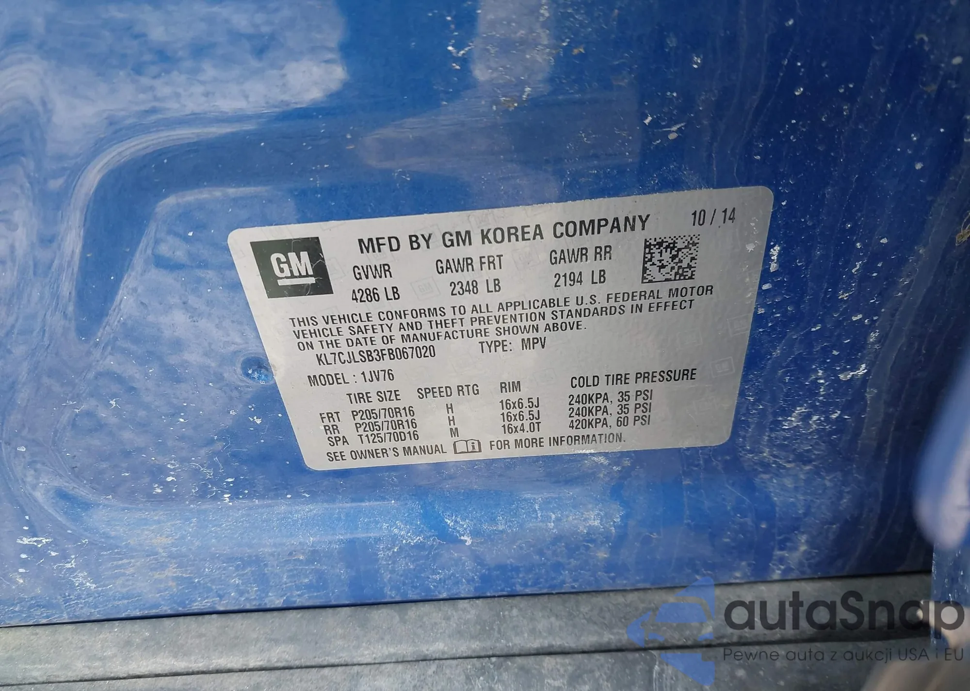 VIN: KL7CJLSB3FB067020