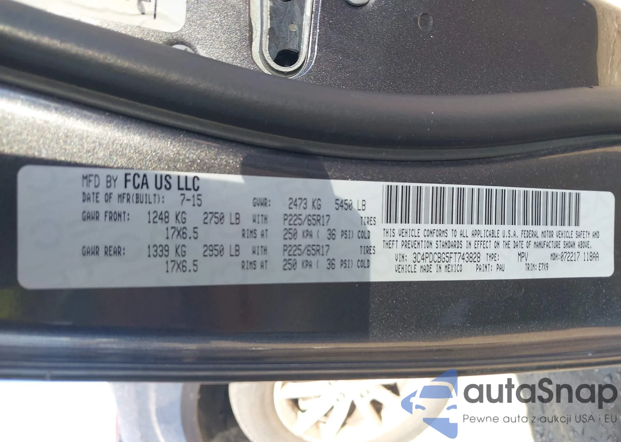 Samochód Dodge Journey 2015 (VIN 3C4PDCBG5FT743828) nie był wcześniej licytowany. Dokumenty są czyste, przebieg odpowiada lub jest niższy niż średnia rynku. Sprzedaje go firma ubezpieczeniowa – polecamy zakup. Dostawa do portu zajmie ok. 6–8 tygodni.