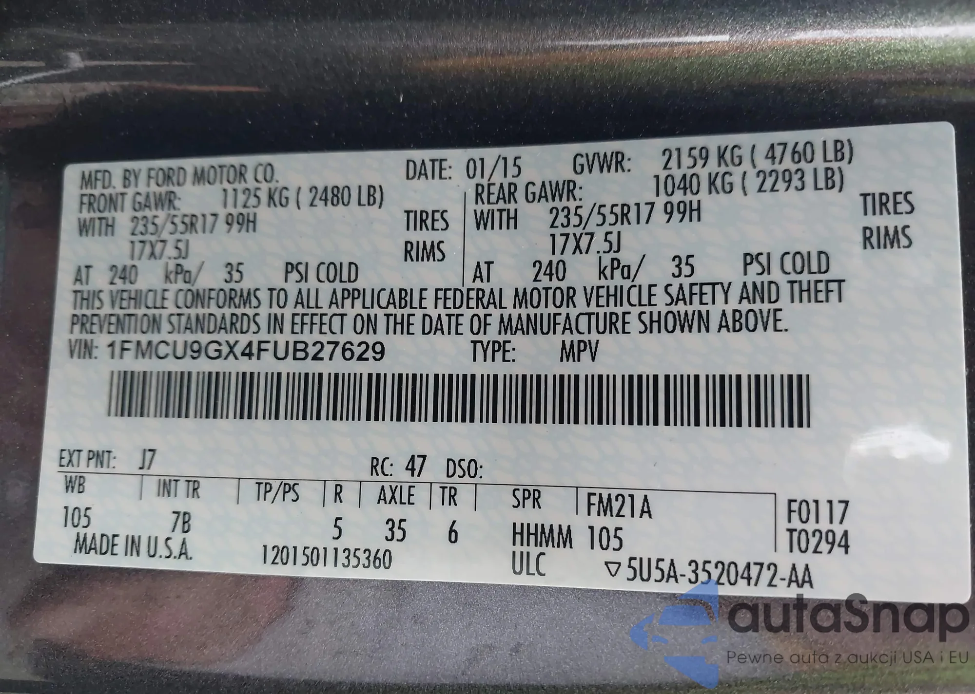 VIN: 1FMCU9GX4FUB27629