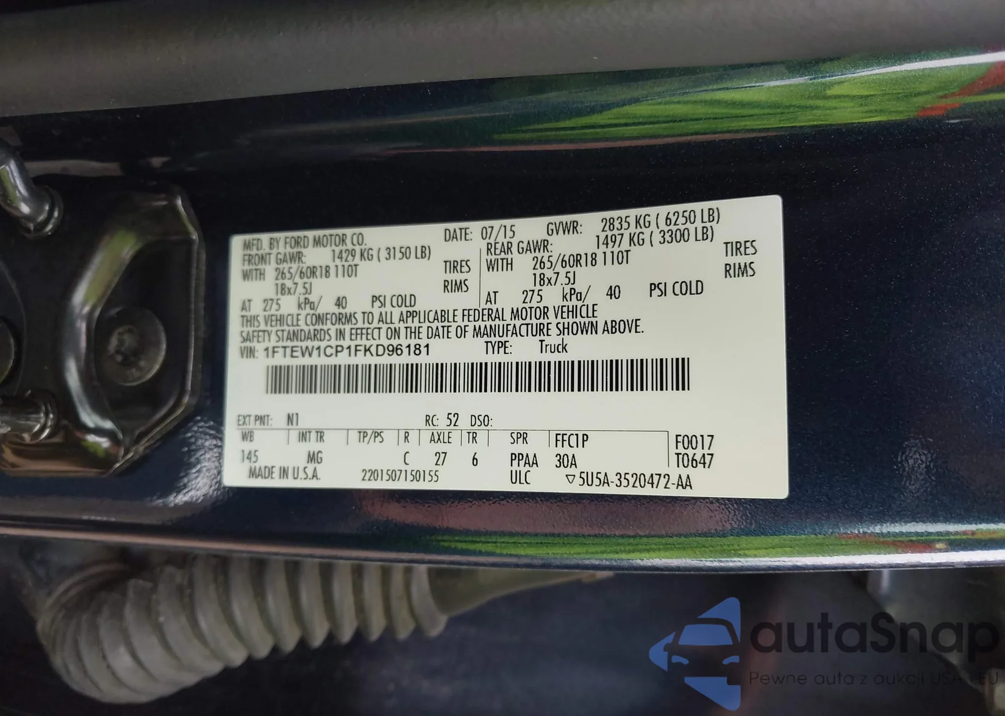 Samochód Ford F-150 2015 (VIN 1FTEW1CP1FKD96181) był już licytowany 1 razy i/lub sprzedaje go niezweryfikowany sprzedawca. Zalecamy raport Carfax i potwierdzenie możliwości rejestracji pojazdu przed zakupem.