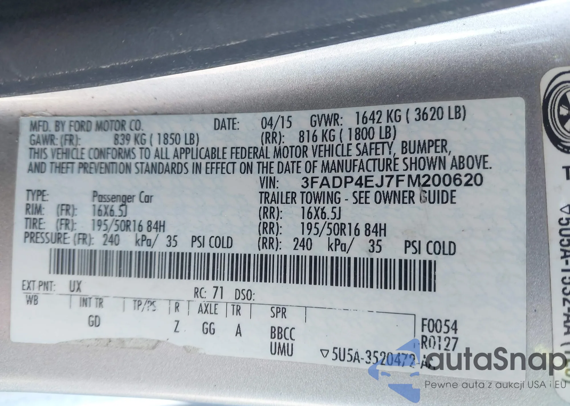 • VIN: 3FADP4EJ7FM200620