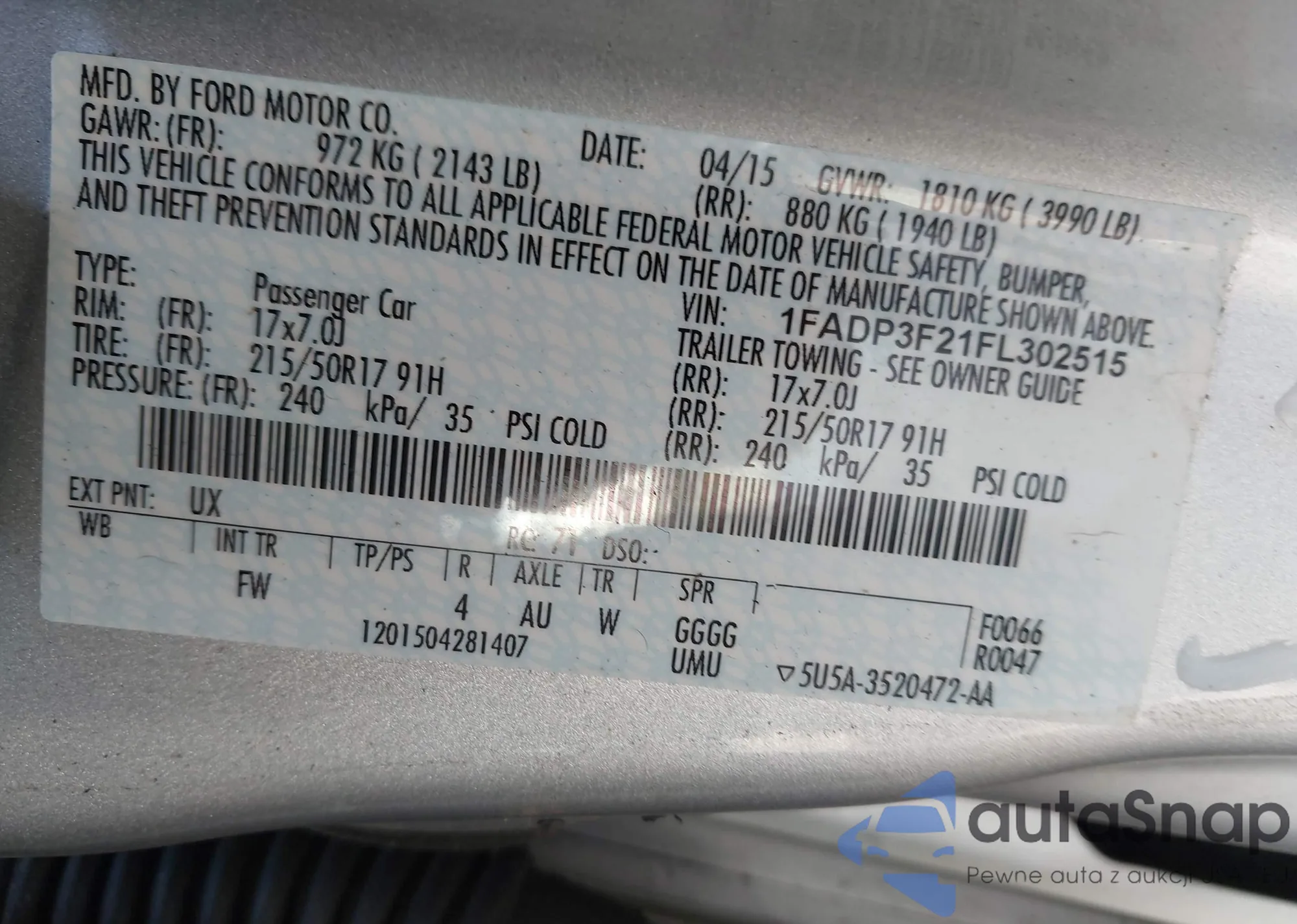 VIN: 1FADP3F21FL302515