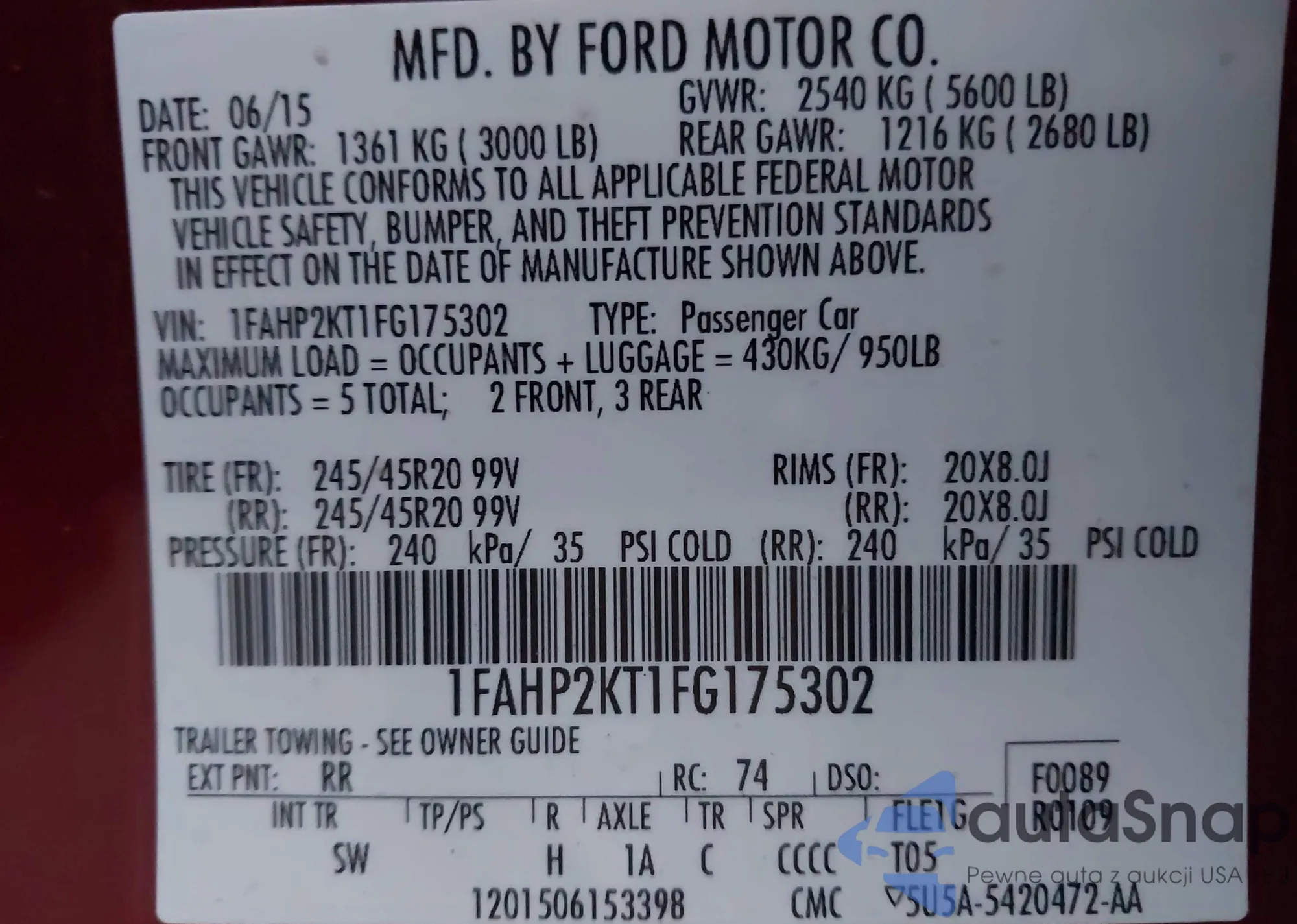Samochód Ford Taurus 2015 (VIN 1FAHP2KT1FG175302) nie był wcześniej licytowany. Dokumenty są czyste, przebieg odpowiada lub jest niższy niż średnia rynku. Sprzedaje go firma ubezpieczeniowa – polecamy zakup. Dostawa do portu zajmie ok. 6–8 tygodni.