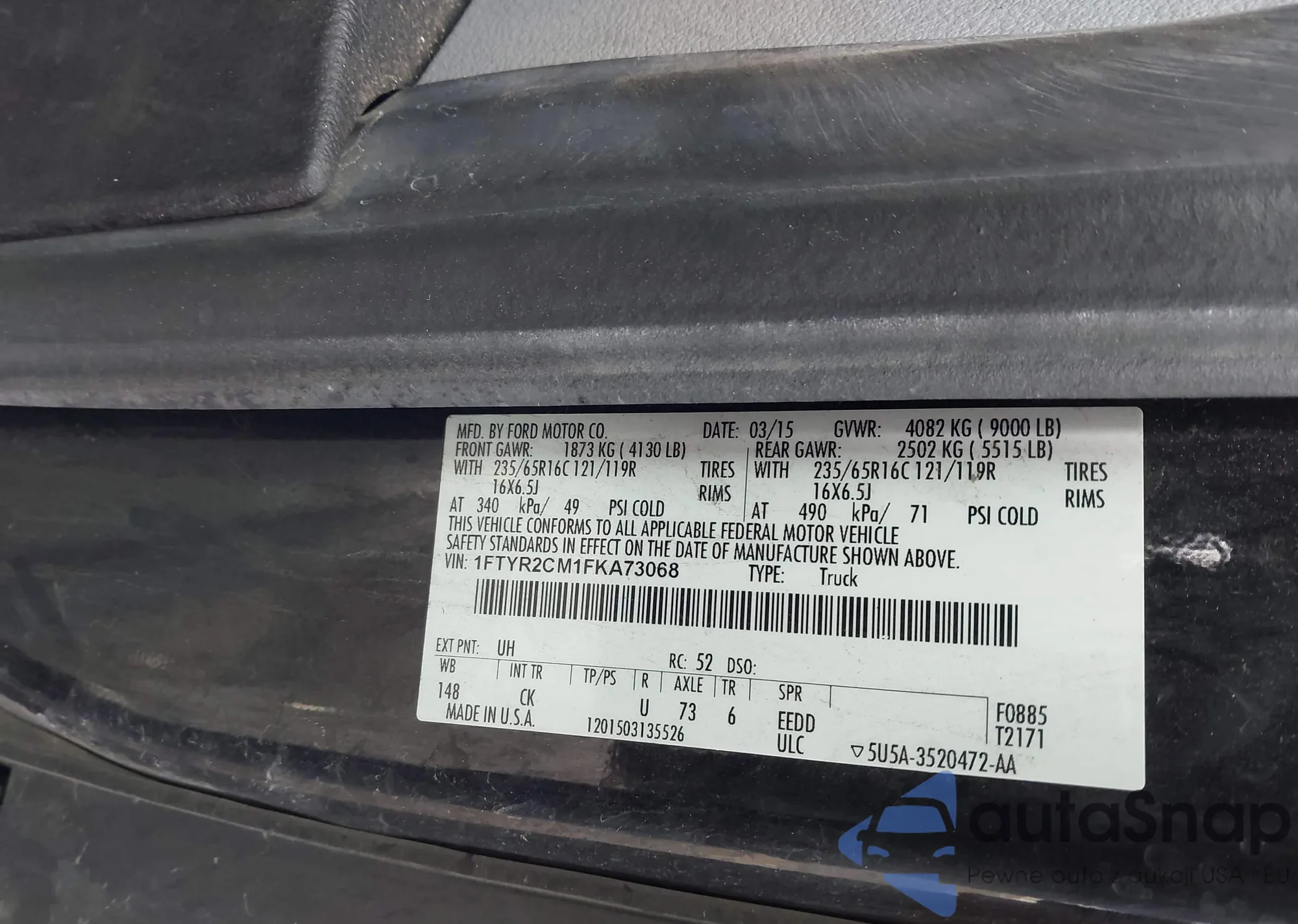 Samochód Ford Transit 2015 (VIN 1FTYR2CM1FKA73068) sprzedaje go niezweryfikowany sprzedawca. Zalecamy raport Carfax i potwierdzenie możliwości rejestracji pojazdu przed zakupem.
