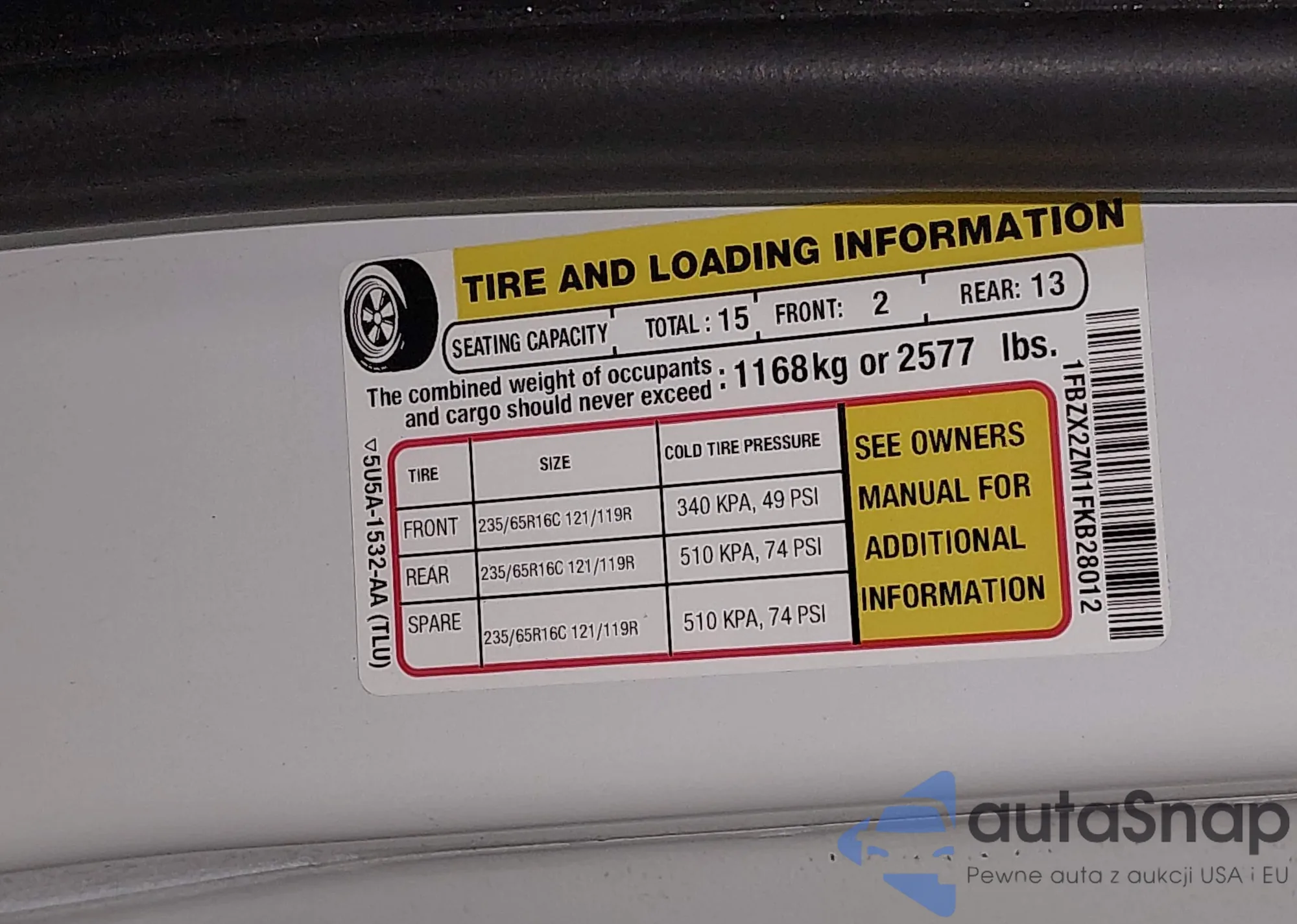 Samochód Ford Transit 2015 (VIN 1FBZX2ZM1FKB28012) ma dokumenty uniemożliwiające rejestrację. Mogą pojawić się trudności przy eksporcie i rejestracji. Skontaktuj się z ekspertami AutaSnap w celu znalezienia alternatywy.