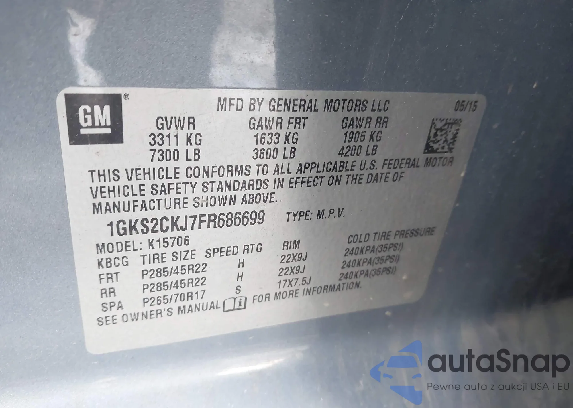 Samochód GMC Yukon 2015 (VIN 1GKS2CKJ7FR686699) nie był wcześniej licytowany. Dokumenty są czyste, przebieg odpowiada lub jest niższy niż średnia rynku. Sprzedaje go firma ubezpieczeniowa – polecamy zakup. Dostawa do portu zajmie ok. 6–8 tygodni.
