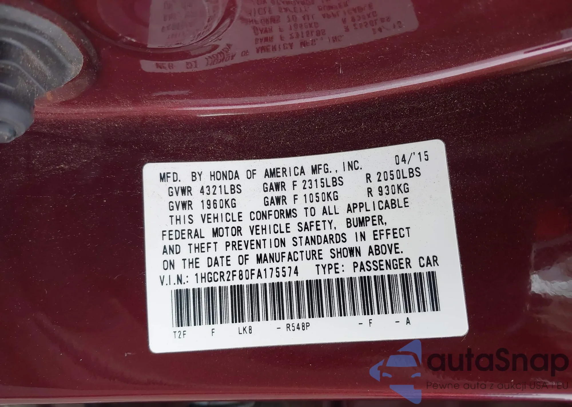 Samochód Honda Accord 2015 (VIN 1HGCR2F80FA175574) nie był wcześniej licytowany. Dokumenty są czyste, przebieg odpowiada lub jest niższy niż średnia rynku. Sprzedaje go firma ubezpieczeniowa – polecamy zakup. Dostawa do portu zajmie ok. 6–8 tygodni.