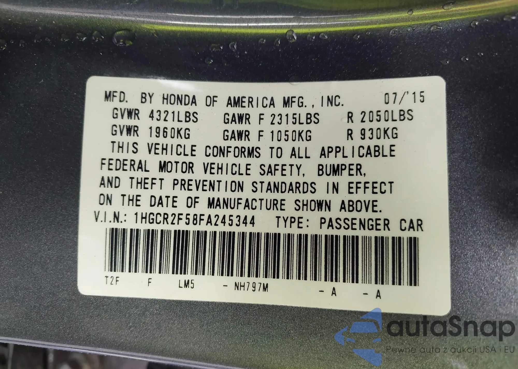 Samochód Honda Accord 2015 (VIN 1HGCR2F58FA245344) nie był wcześniej licytowany. Dokumenty są czyste, przebieg odpowiada lub jest niższy niż średnia rynku. Sprzedaje go firma ubezpieczeniowa – polecamy zakup. Dostawa do portu zajmie ok. 6–8 tygodni.