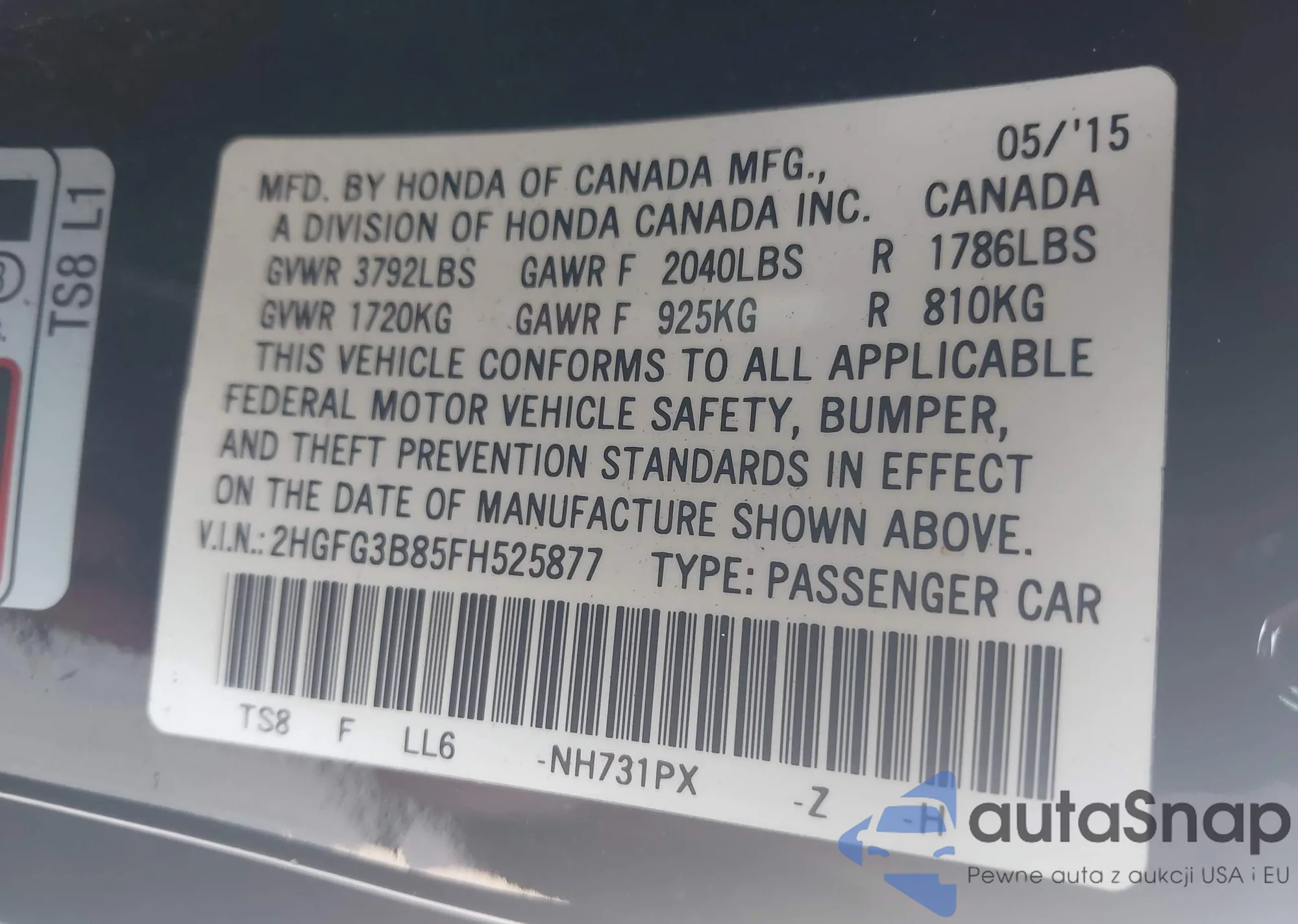 VIN: 2HGFG3B85FH525877