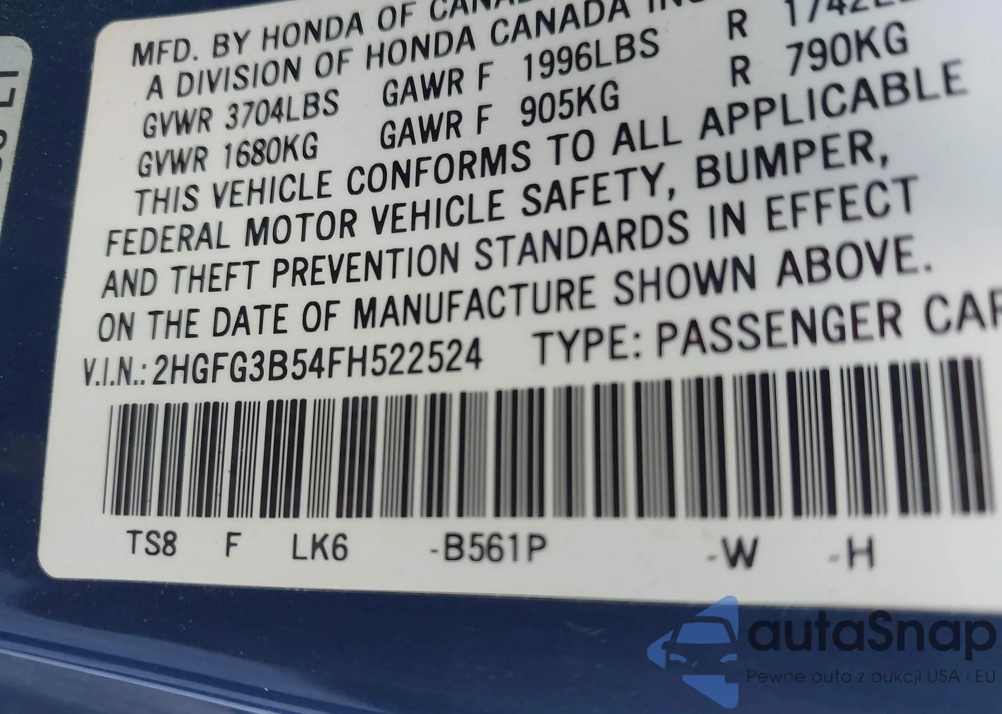 • VIN: 2HGFG3B54FH522524
