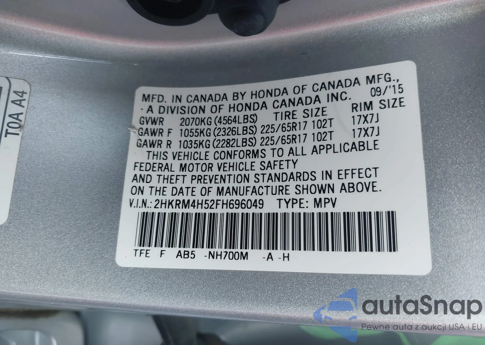 Samochód Honda CR-V 2015 (VIN 2HKRM4H52FH696049) nie był wcześniej licytowany. Dokumenty są czyste, przebieg odpowiada lub jest niższy niż średnia rynku. Sprzedaje go firma ubezpieczeniowa – polecamy zakup. Dostawa do portu zajmie ok. 6–8 tygodni.