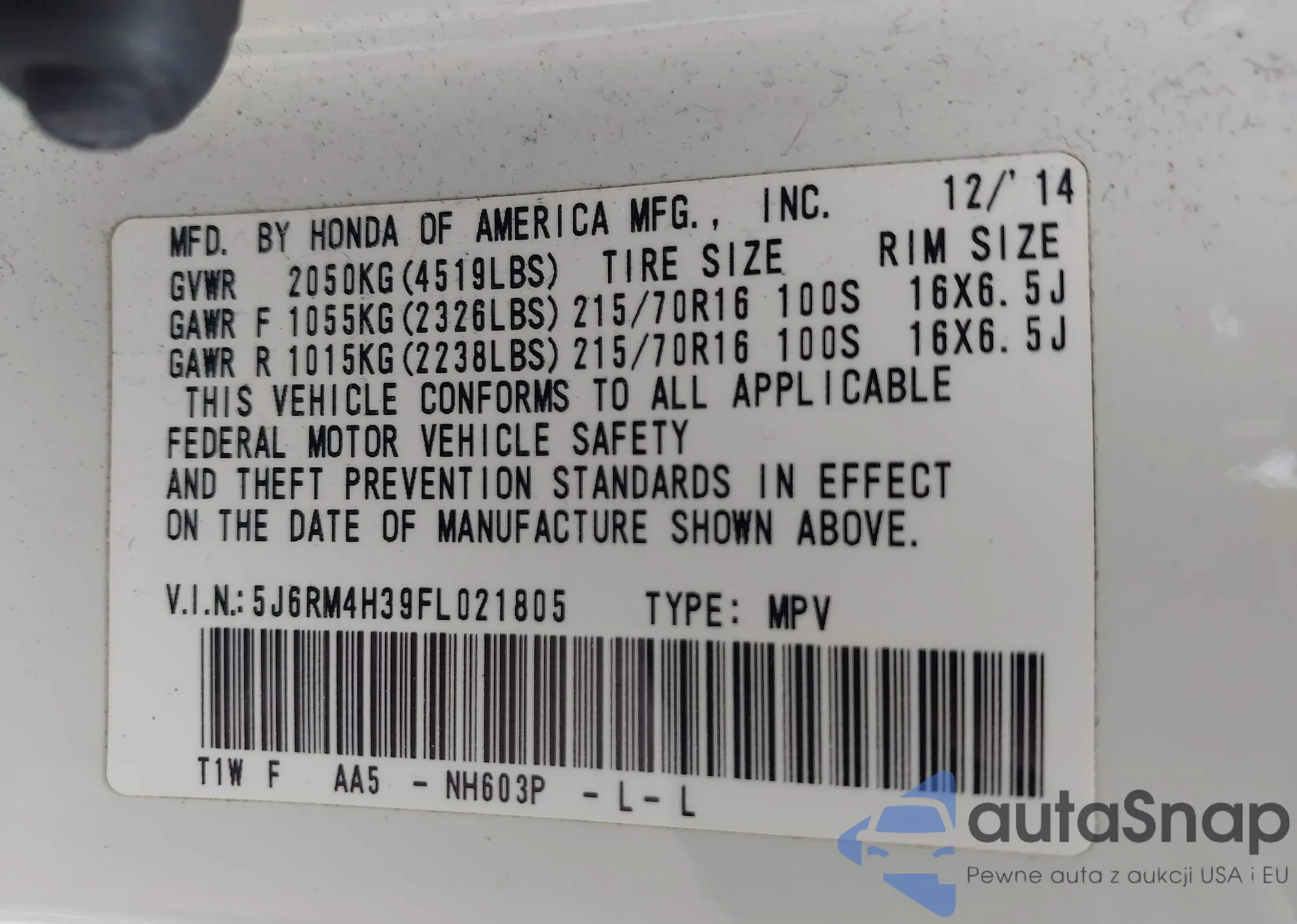 VIN: 5J6RM4H39FL021805