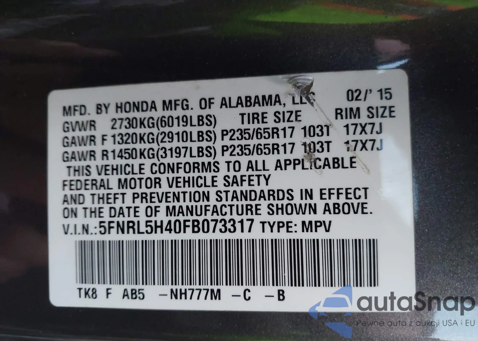 Samochód Honda Odyssey 2015 (VIN 5FNRL5H40FB073317) nie był wcześniej licytowany. Dokumenty są czyste, przebieg odpowiada lub jest niższy niż średnia rynku. Sprzedaje go firma ubezpieczeniowa – polecamy zakup. Dostawa do portu zajmie ok. 6–8 tygodni.