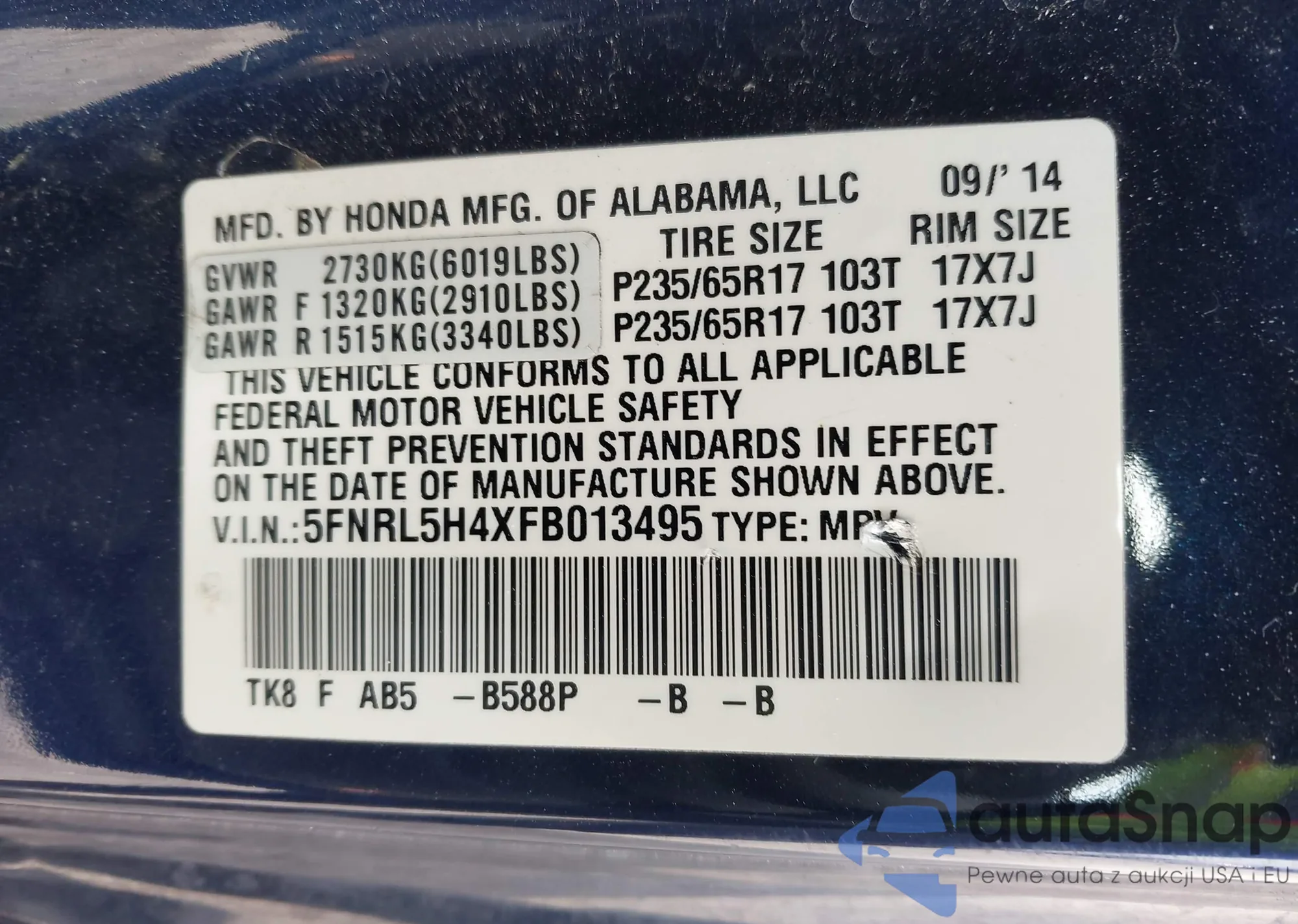 VIN: 5FNRL5H4XFB013495