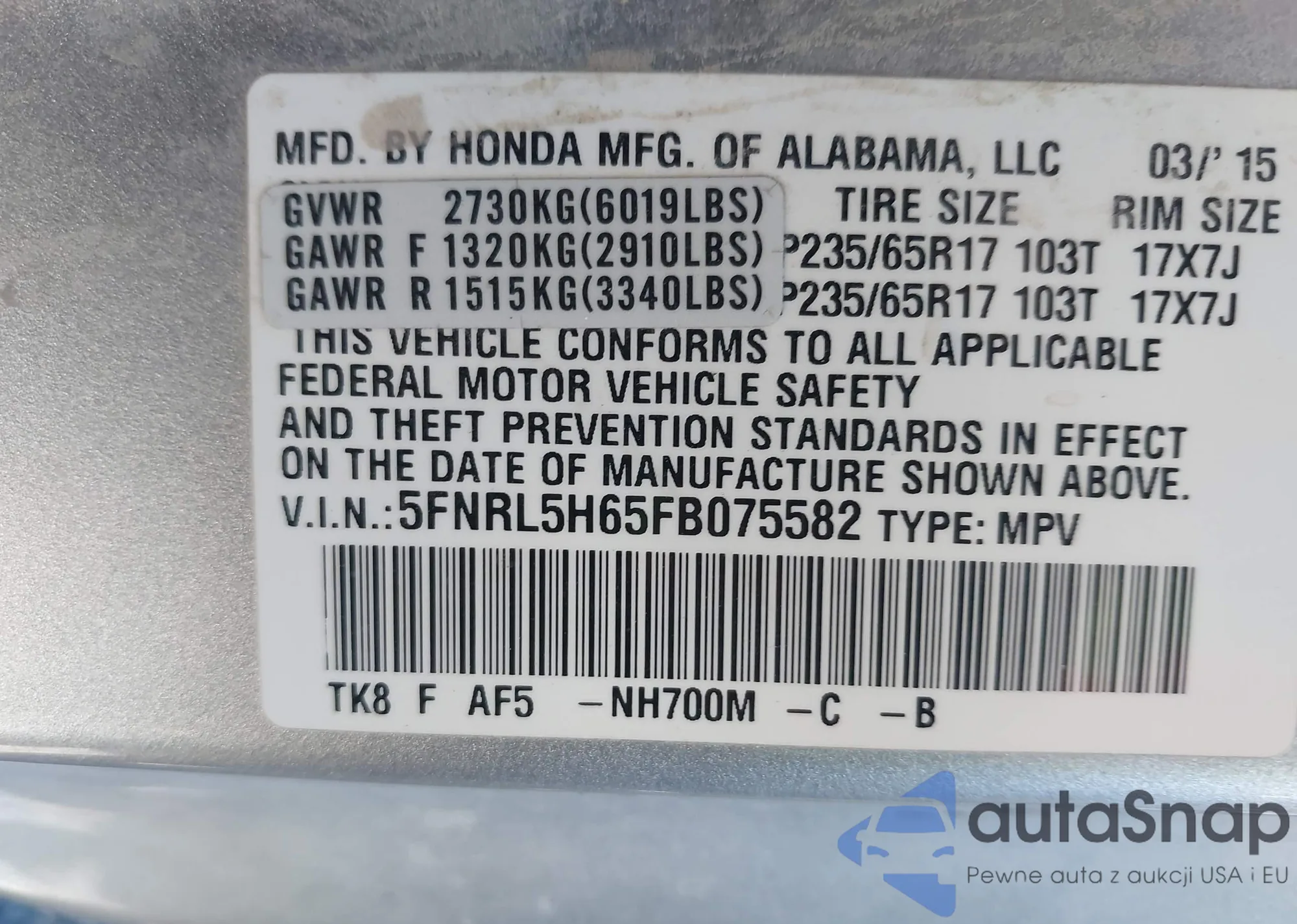 Samochód Honda Odyssey 2015 (VIN 5FNRL5H65FB075582) nie był wcześniej licytowany. Dokumenty są czyste, przebieg odpowiada lub jest niższy niż średnia rynku. Sprzedaje go firma ubezpieczeniowa – polecamy zakup. Dostawa do portu zajmie ok. 6–8 tygodni.
