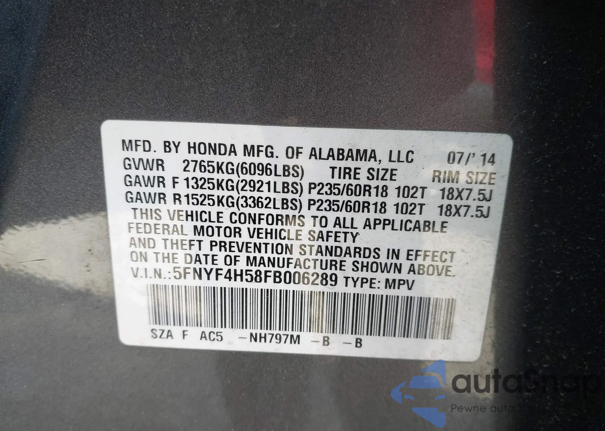 VIN: 5FNYF4H58FB006289