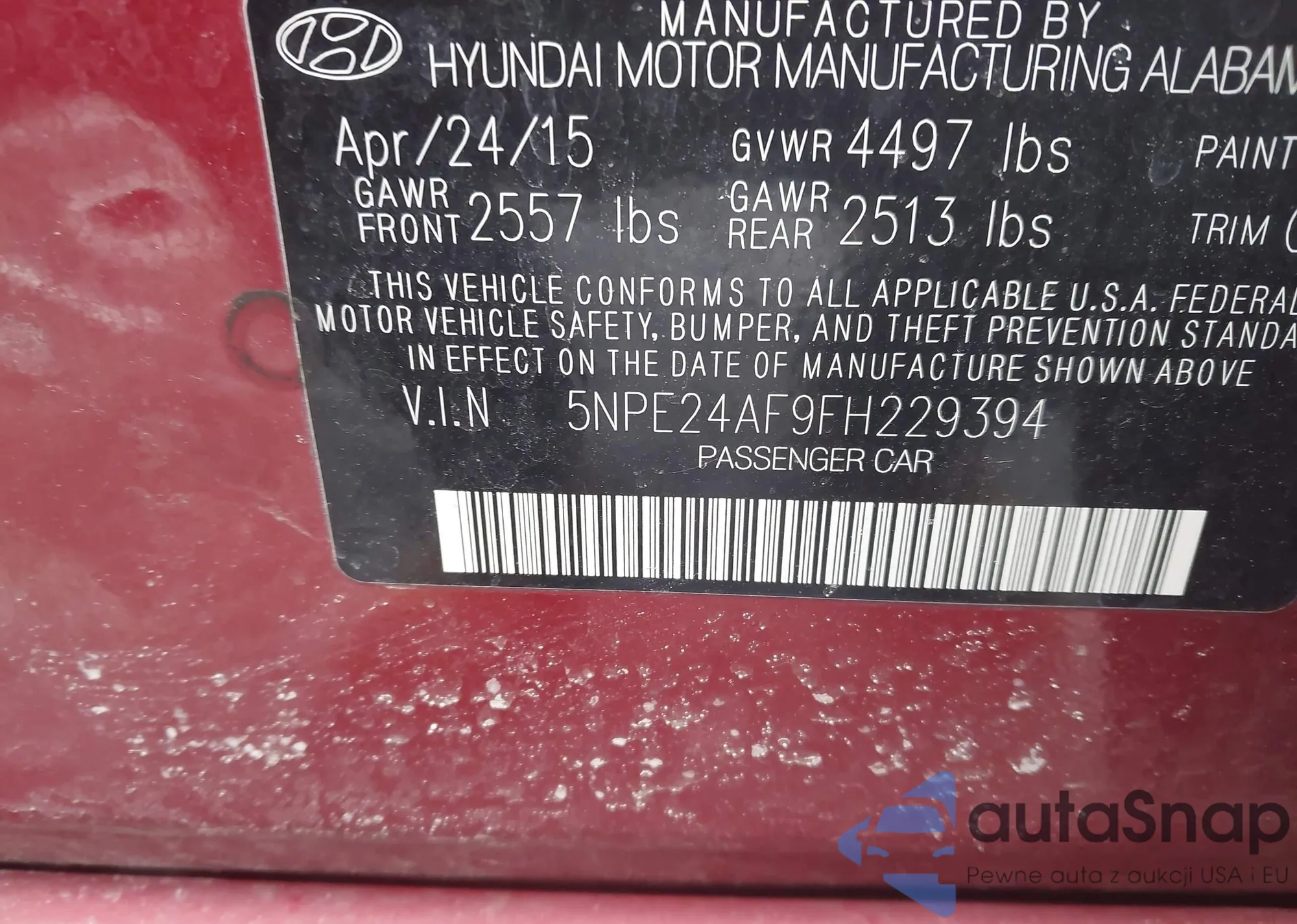 Samochód Hyundai Sonata 2015 (VIN 5NPE24AF9FH229394) nie był wcześniej licytowany. Dokumenty są czyste, przebieg odpowiada lub jest niższy niż średnia rynku. Sprzedaje go firma ubezpieczeniowa – polecamy zakup. Dostawa do portu zajmie ok. 6–8 tygodni.