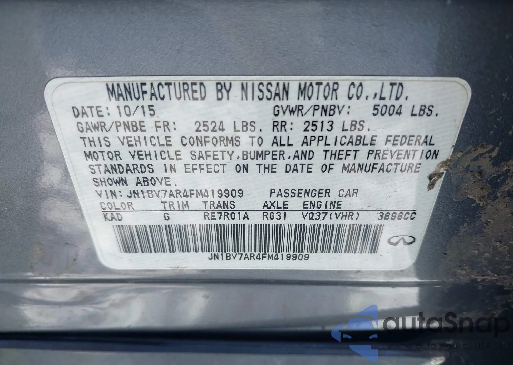 Samochód Infiniti Q50 2015 (VIN JN1BV7AR4FM419909) nie był wcześniej licytowany. Dokumenty są czyste, przebieg odpowiada lub jest niższy niż średnia rynku. Sprzedaje go firma ubezpieczeniowa – polecamy zakup. Dostawa do portu zajmie ok. 6–8 tygodni.
