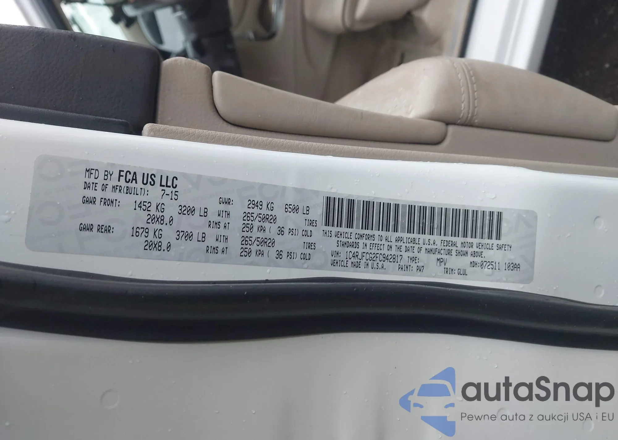 Samochód Jeep Grand Cherokee 2015 (VIN 1C4RJFCG2FC942817) ma dokumenty uniemożliwiające rejestrację. Mogą pojawić się trudności przy eksporcie i rejestracji. Skontaktuj się z ekspertami AutaSnap w celu znalezienia alternatywy.