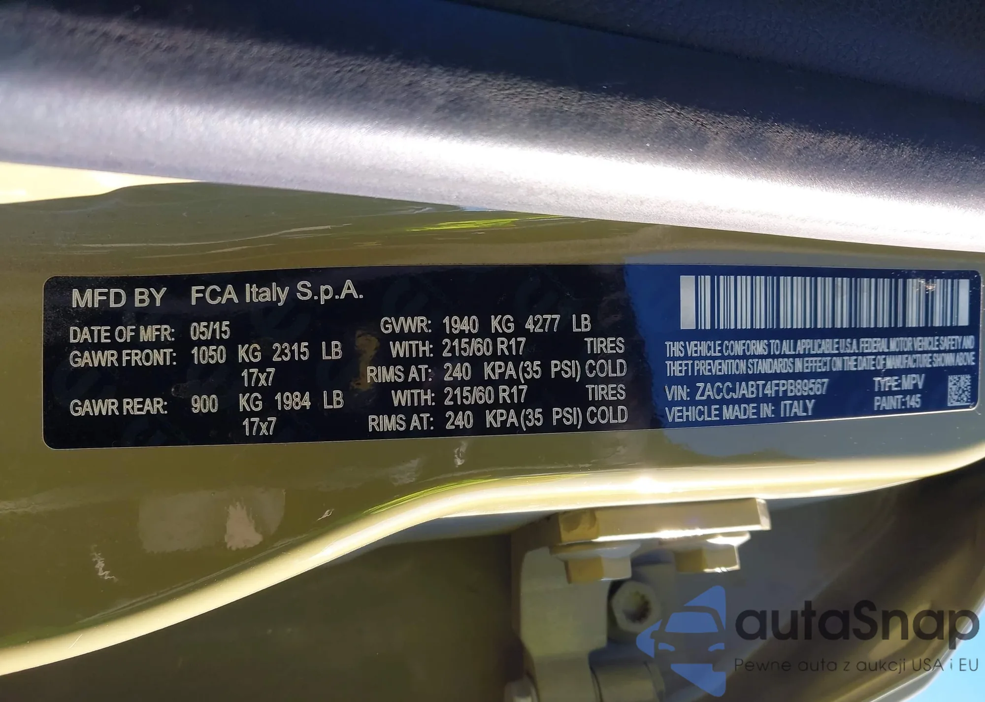 Samochód Jeep Renegade 2015 (VIN ZACCJABT4FPB89567) nie był wcześniej licytowany. Dokumenty są czyste, przebieg odpowiada lub jest niższy niż średnia rynku. Sprzedaje go firma ubezpieczeniowa – polecamy zakup. Dostawa do portu zajmie ok. 6–8 tygodni.