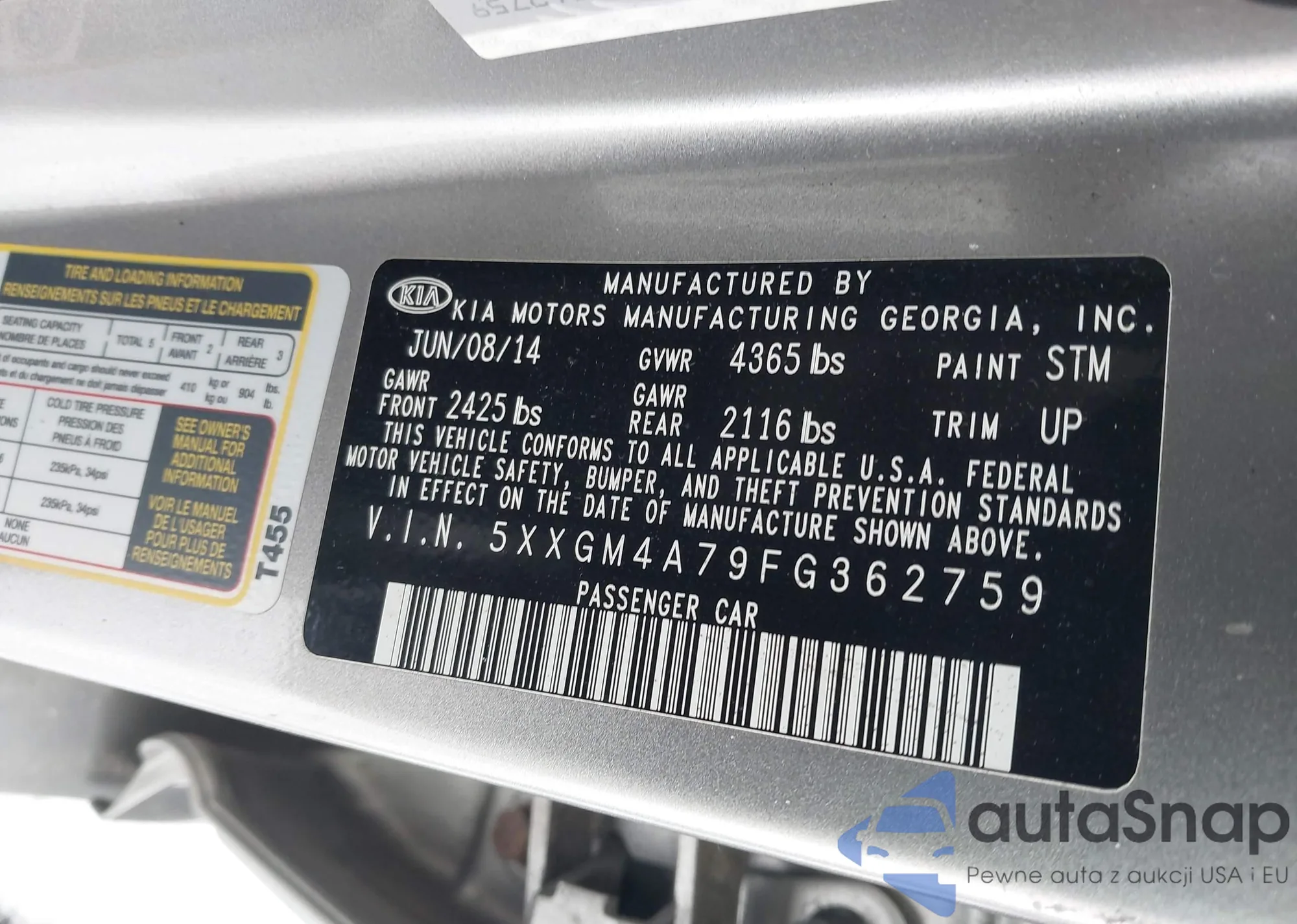 Samochód Kia Optima 2015 (VIN 5XXGM4A79FG362759) nie był wcześniej licytowany. Dokumenty są czyste, przebieg odpowiada lub jest niższy niż średnia rynku. Sprzedaje go firma ubezpieczeniowa – polecamy zakup. Dostawa do portu zajmie ok. 6–8 tygodni.