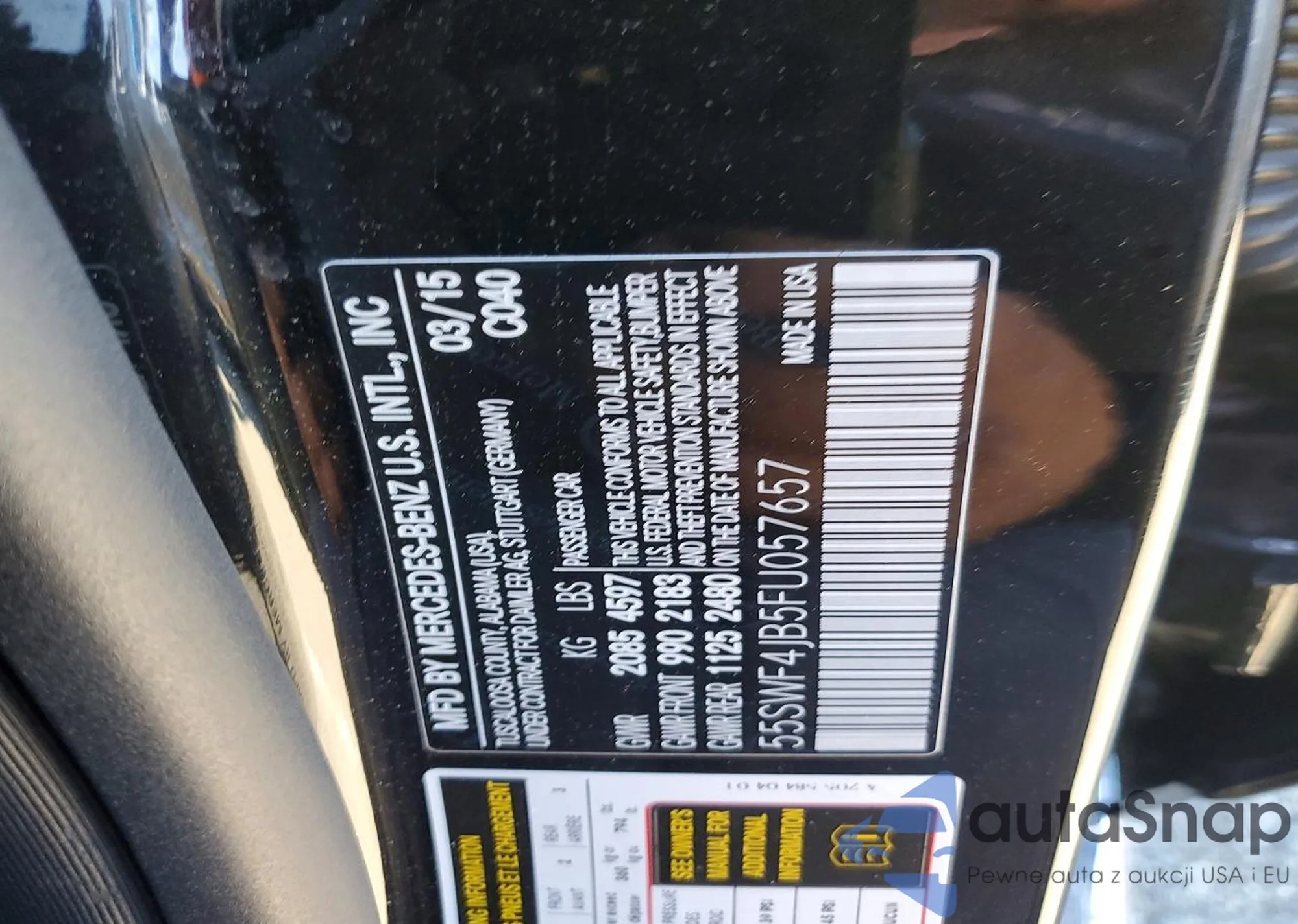 Samochód Mercedes-Benz C-klasse 2015 (VIN 55SWF4JB5FU057657) nie był wcześniej licytowany. Dokumenty są czyste, przebieg odpowiada lub jest niższy niż średnia rynku. Sprzedaje go firma ubezpieczeniowa – polecamy zakup. Dostawa do portu zajmie ok. 6–8 tygodni.