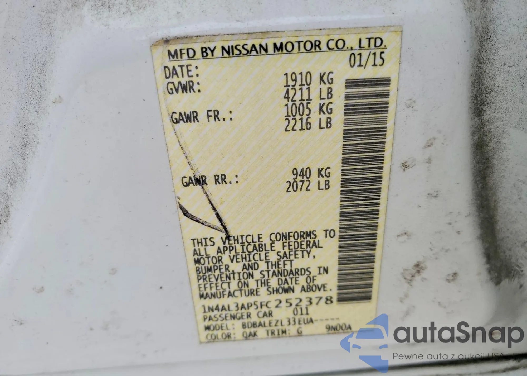 Samochód Nissan Altima 2015 (VIN 1N4AL3AP5FC252378) sprzedaje go niezweryfikowany sprzedawca. Zalecamy raport Carfax i potwierdzenie możliwości rejestracji pojazdu przed zakupem.