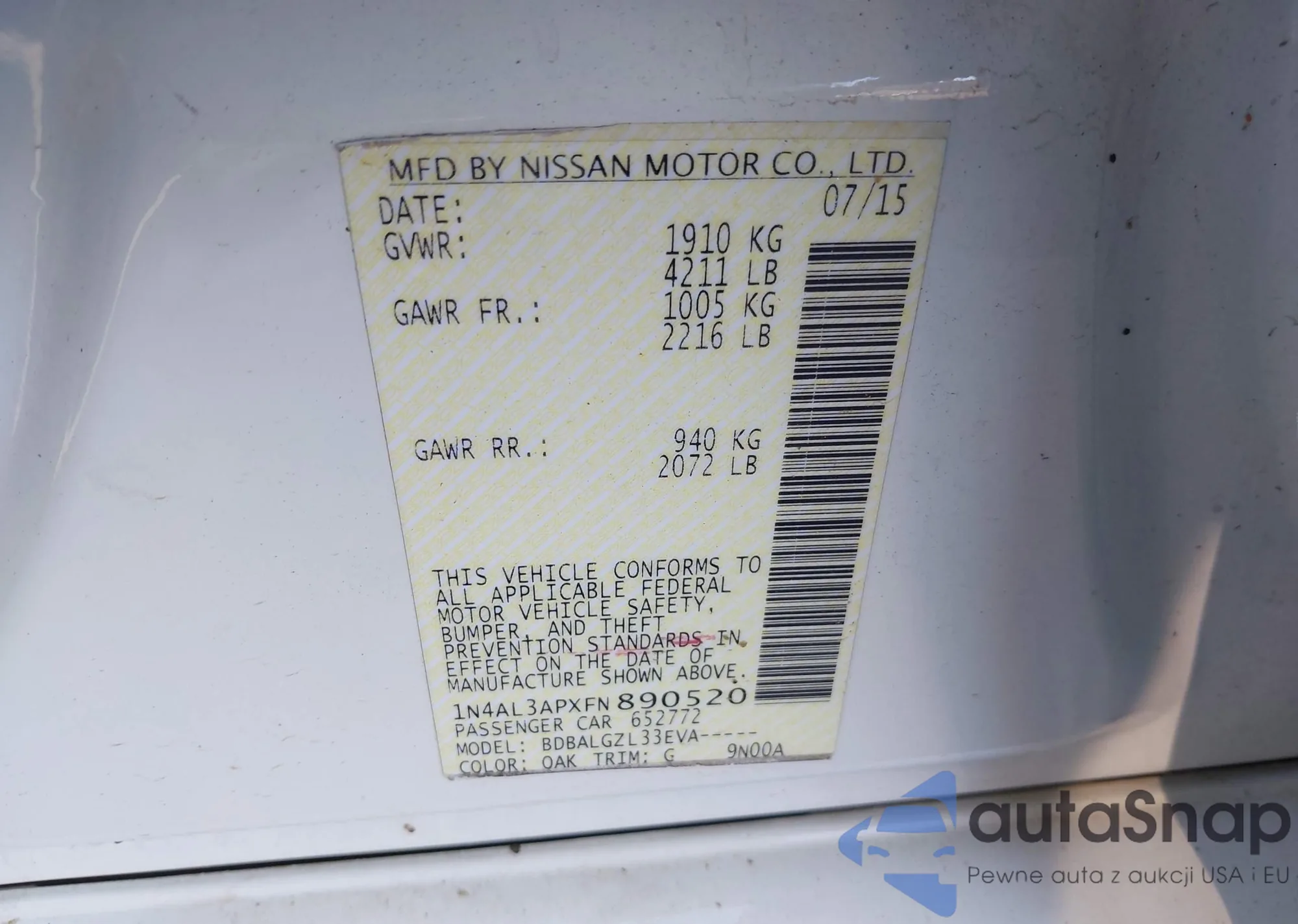 • VIN: 1N4AL3APXFN890520