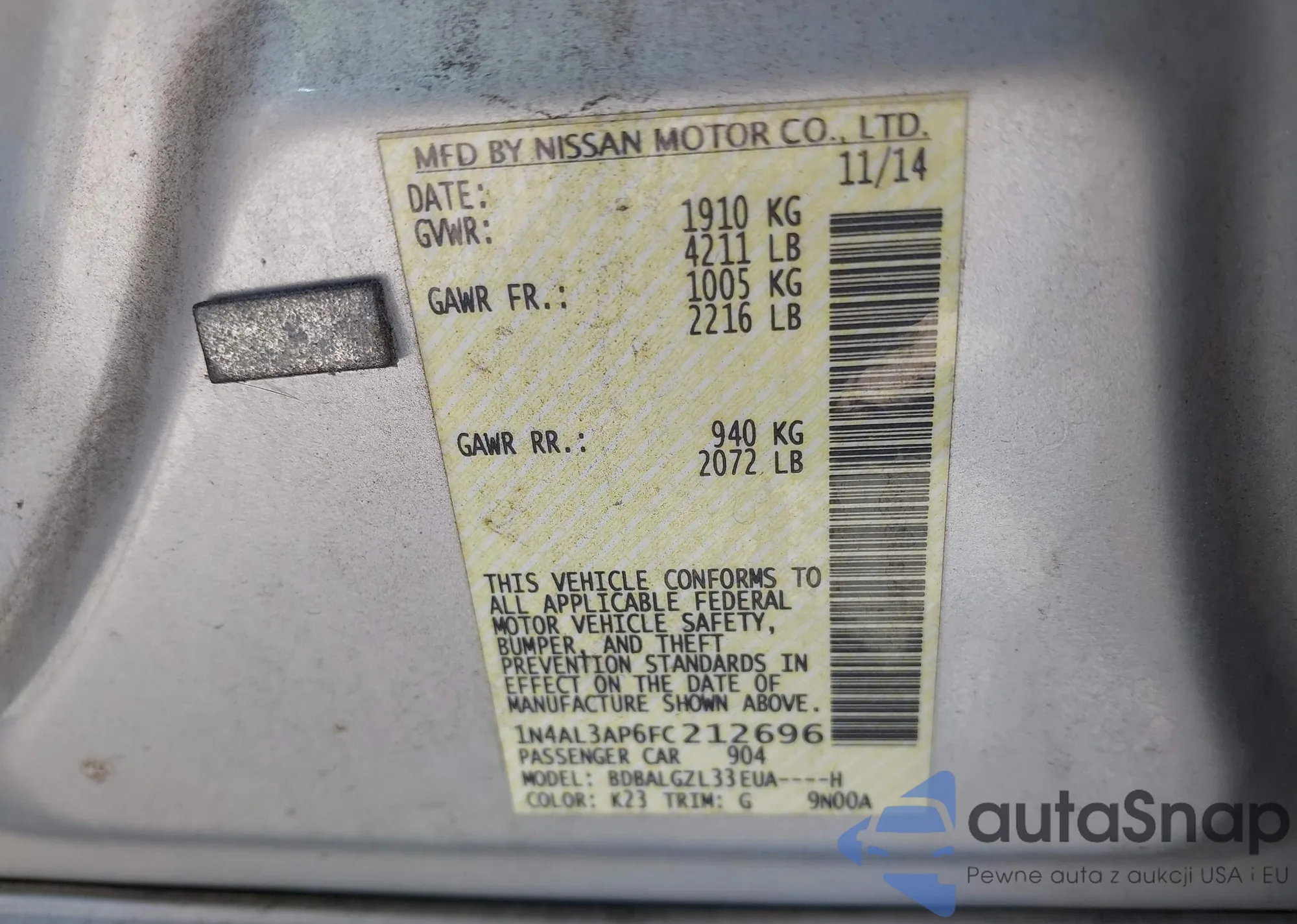 Samochód Nissan Altima 2015 (VIN 1N4AL3AP6FC212696) nie był wcześniej licytowany. Dokumenty są czyste, przebieg odpowiada lub jest niższy niż średnia rynku. Sprzedaje go firma ubezpieczeniowa – polecamy zakup. Dostawa do portu zajmie ok. 6–8 tygodni.