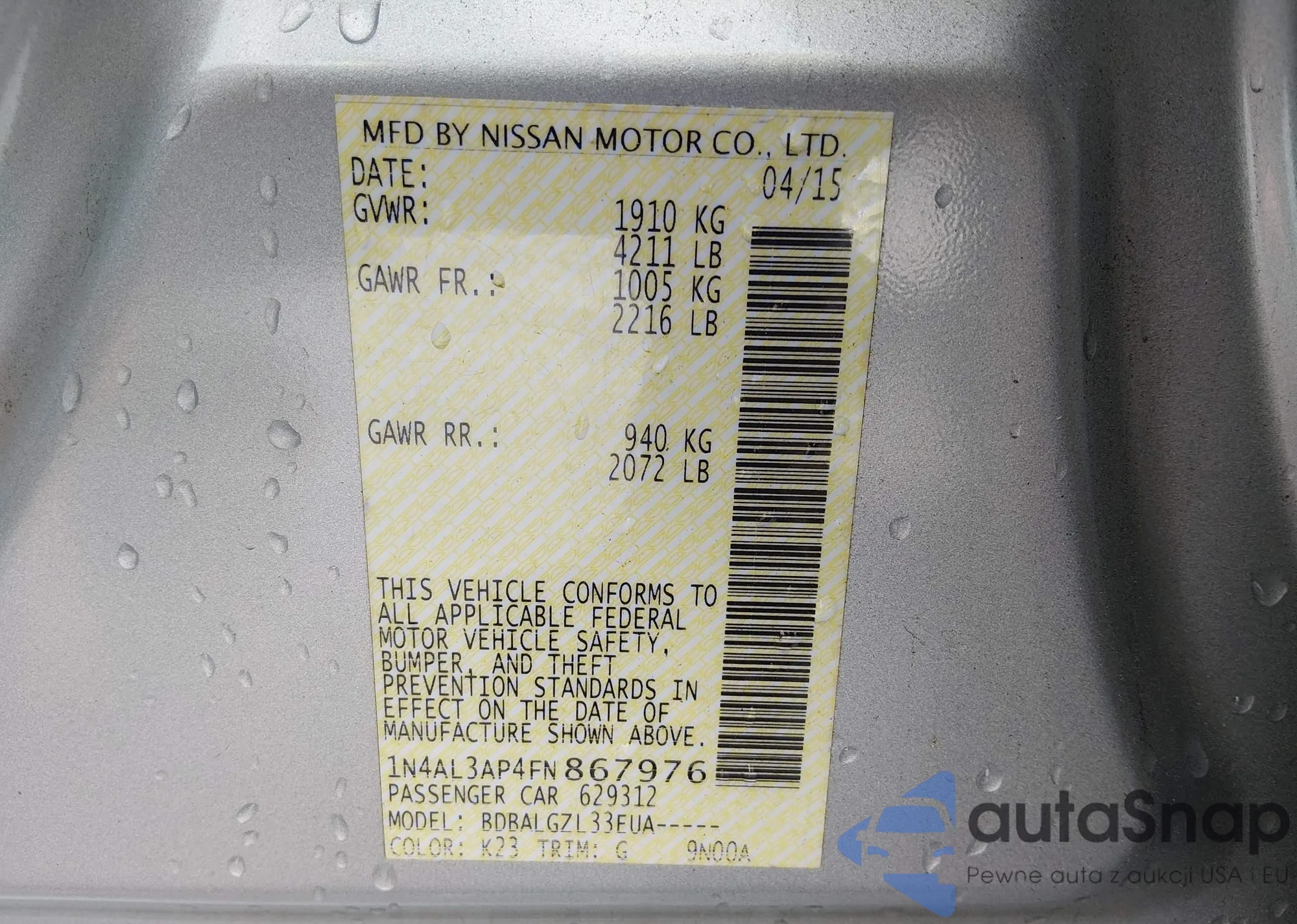 Samochód Nissan Altima 2015 (VIN 1N4AL3AP4FN867976) nie był wcześniej licytowany. Dokumenty są czyste, przebieg odpowiada lub jest niższy niż średnia rynku. Sprzedaje go firma ubezpieczeniowa – polecamy zakup. Dostawa do portu zajmie ok. 6–8 tygodni.
