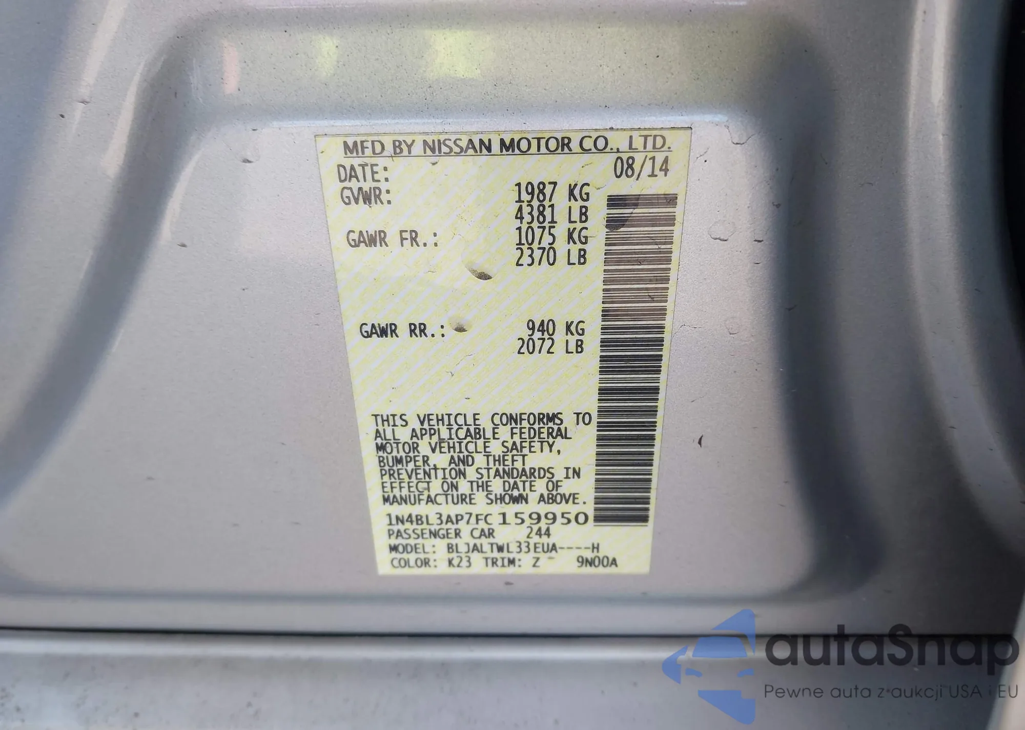 Samochód Nissan Altima 2015 (VIN 1N4BL3AP7FC159950) nie był wcześniej licytowany. Dokumenty są czyste, przebieg odpowiada lub jest niższy niż średnia rynku. Sprzedaje go firma ubezpieczeniowa – polecamy zakup. Dostawa do portu zajmie ok. 6–8 tygodni.