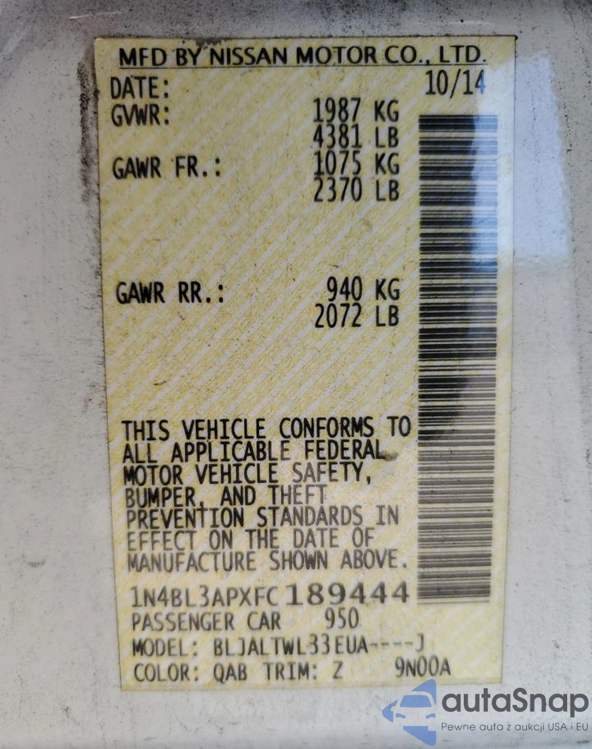 VIN: 1N4BL3APXFC189444