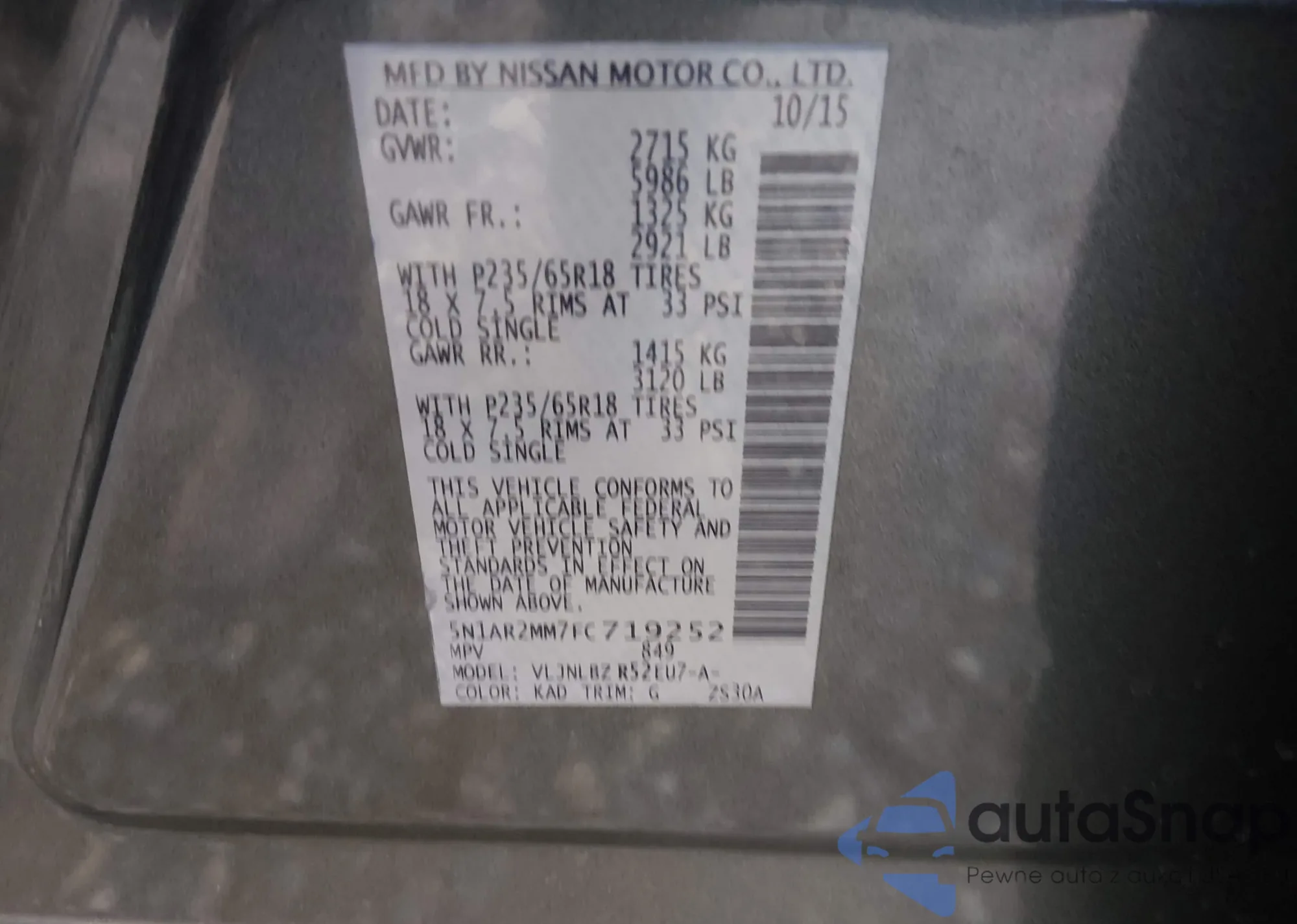 Samochód Nissan Pathfinder 2015 (VIN 5N1AR2MM7FC719252) sprzedaje go niezweryfikowany sprzedawca. Zalecamy raport Carfax i potwierdzenie możliwości rejestracji pojazdu przed zakupem.