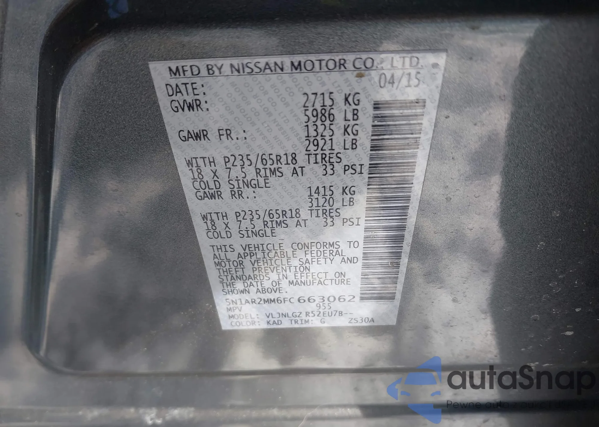 Samochód Nissan Pathfinder 2015 (VIN 5N1AR2MM6FC663062) nie był wcześniej licytowany. Dokumenty są czyste, przebieg odpowiada lub jest niższy niż średnia rynku. Sprzedaje go firma ubezpieczeniowa – polecamy zakup. Dostawa do portu zajmie ok. 6–8 tygodni.