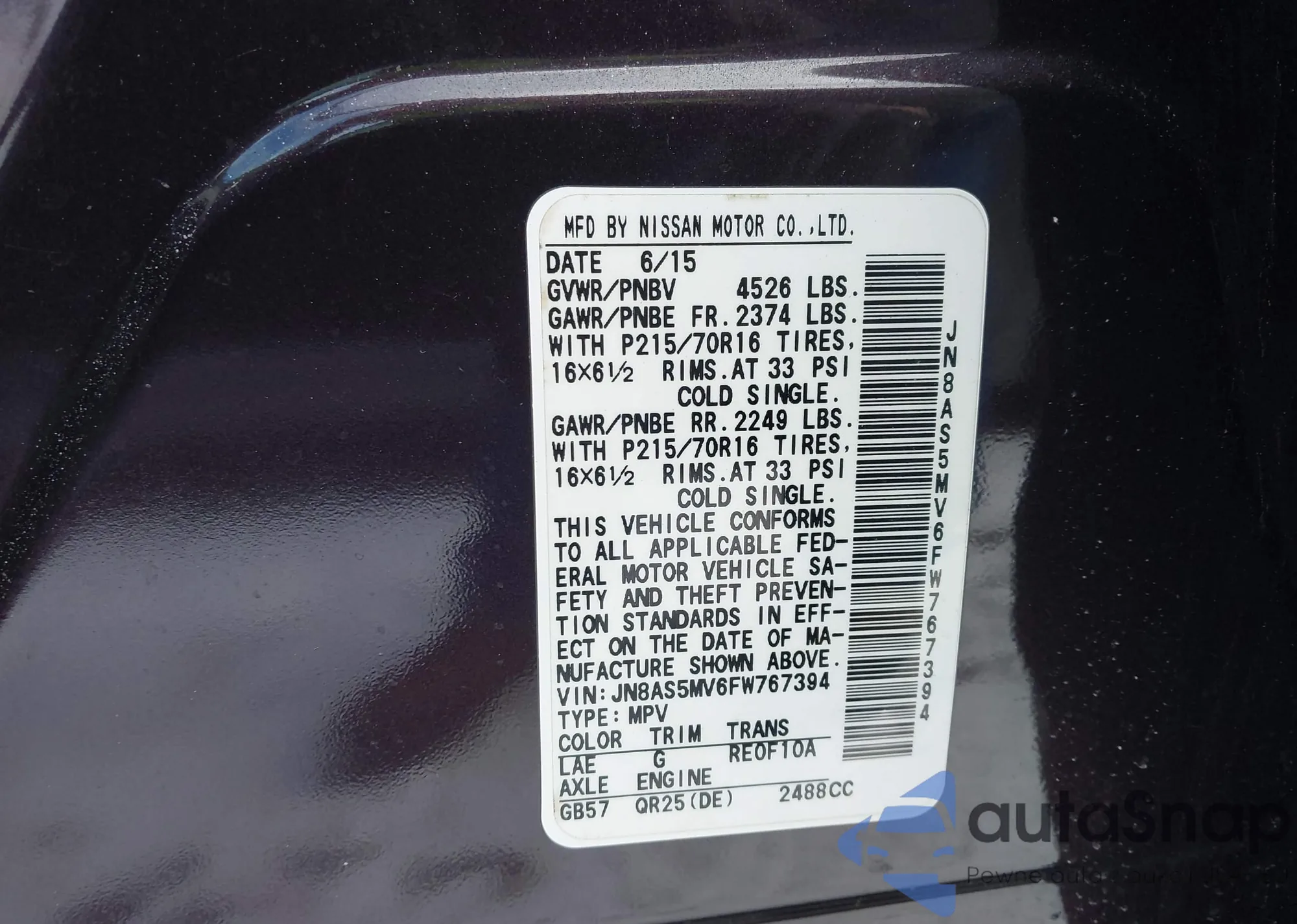 VIN: JN8AS5MV6FW767394