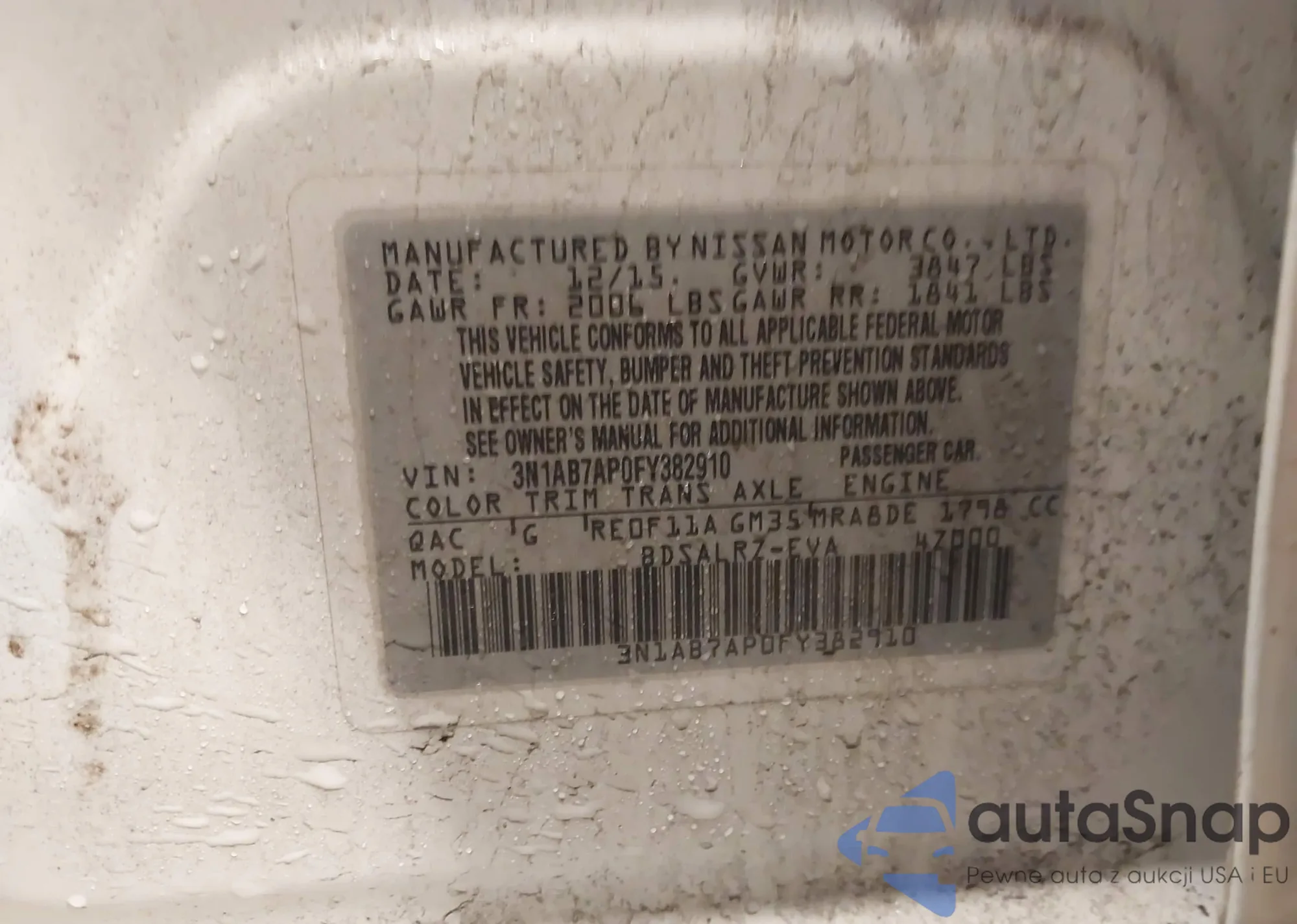 Samochód Nissan Sentra 2015 (VIN 3N1AB7AP0FY382910) nie był wcześniej licytowany. Dokumenty są czyste, przebieg odpowiada lub jest niższy niż średnia rynku. Sprzedaje go firma ubezpieczeniowa – polecamy zakup. Dostawa do portu zajmie ok. 6–8 tygodni.