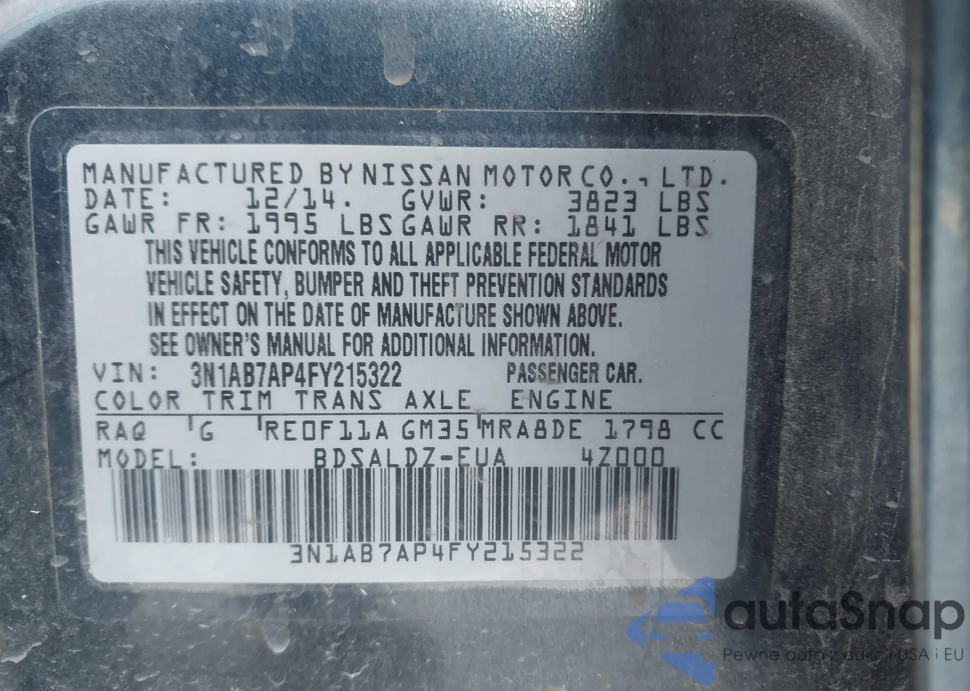 Samochód Nissan Sentra 2015 (VIN 3N1AB7AP4FY215322) nie był wcześniej licytowany. Dokumenty są czyste, przebieg odpowiada lub jest niższy niż średnia rynku. Sprzedaje go firma ubezpieczeniowa – polecamy zakup. Dostawa do portu zajmie ok. 6–8 tygodni.