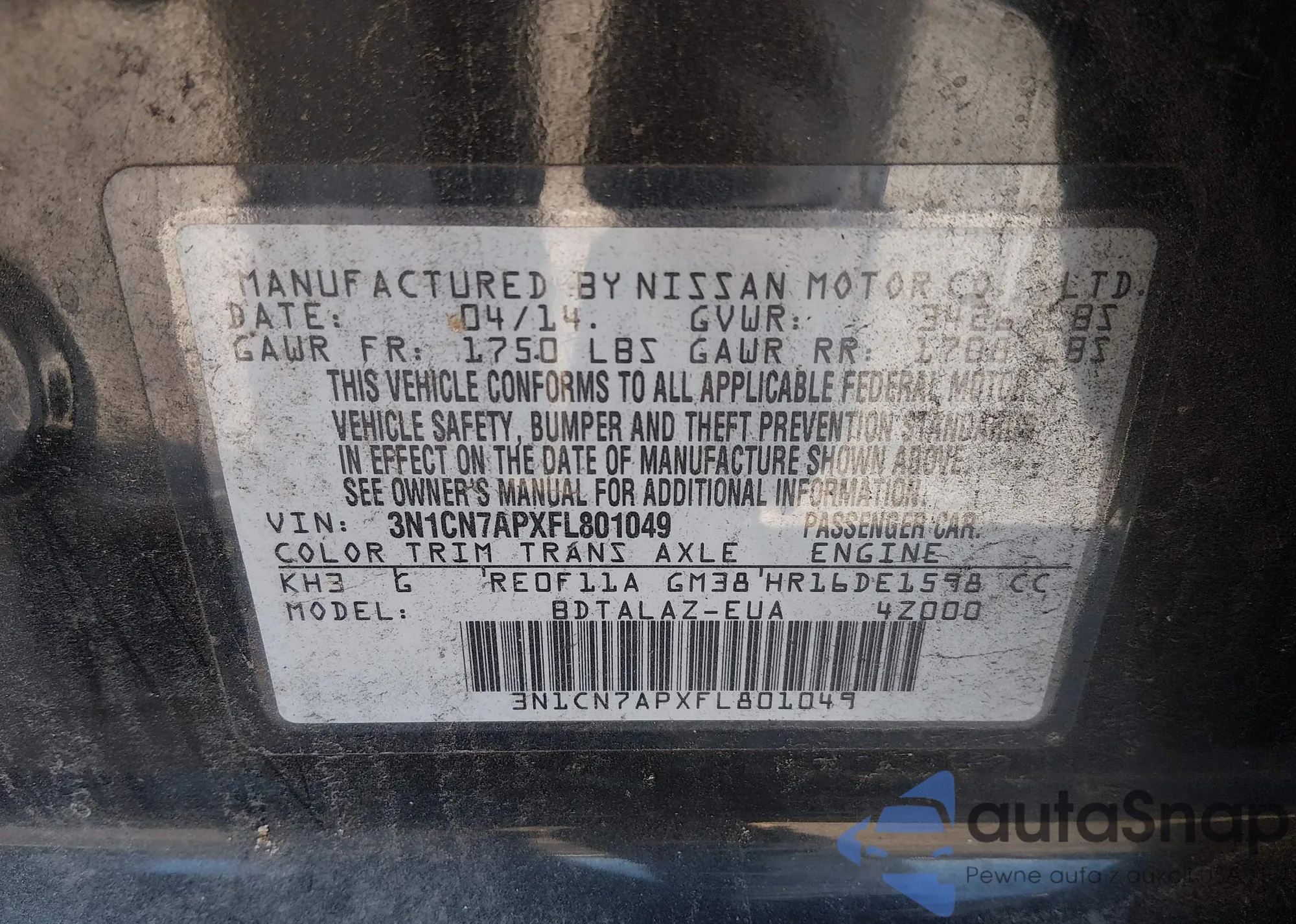 Samochód Nissan Versa 2015 (VIN 3N1CN7APXFL801049) nie był wcześniej licytowany. Dokumenty są czyste, przebieg odpowiada lub jest niższy niż średnia rynku. Sprzedaje go firma ubezpieczeniowa – polecamy zakup. Dostawa do portu zajmie ok. 6–8 tygodni.