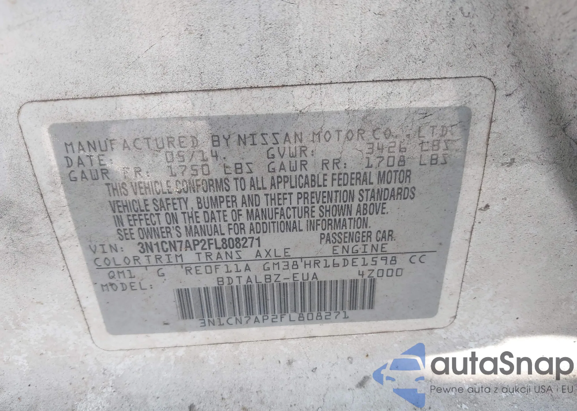 Samochód Nissan Versa 2015 (VIN 3N1CN7AP2FL808271) nie był wcześniej licytowany. Dokumenty są czyste, przebieg odpowiada lub jest niższy niż średnia rynku. Sprzedaje go firma ubezpieczeniowa – polecamy zakup. Dostawa do portu zajmie ok. 6–8 tygodni.