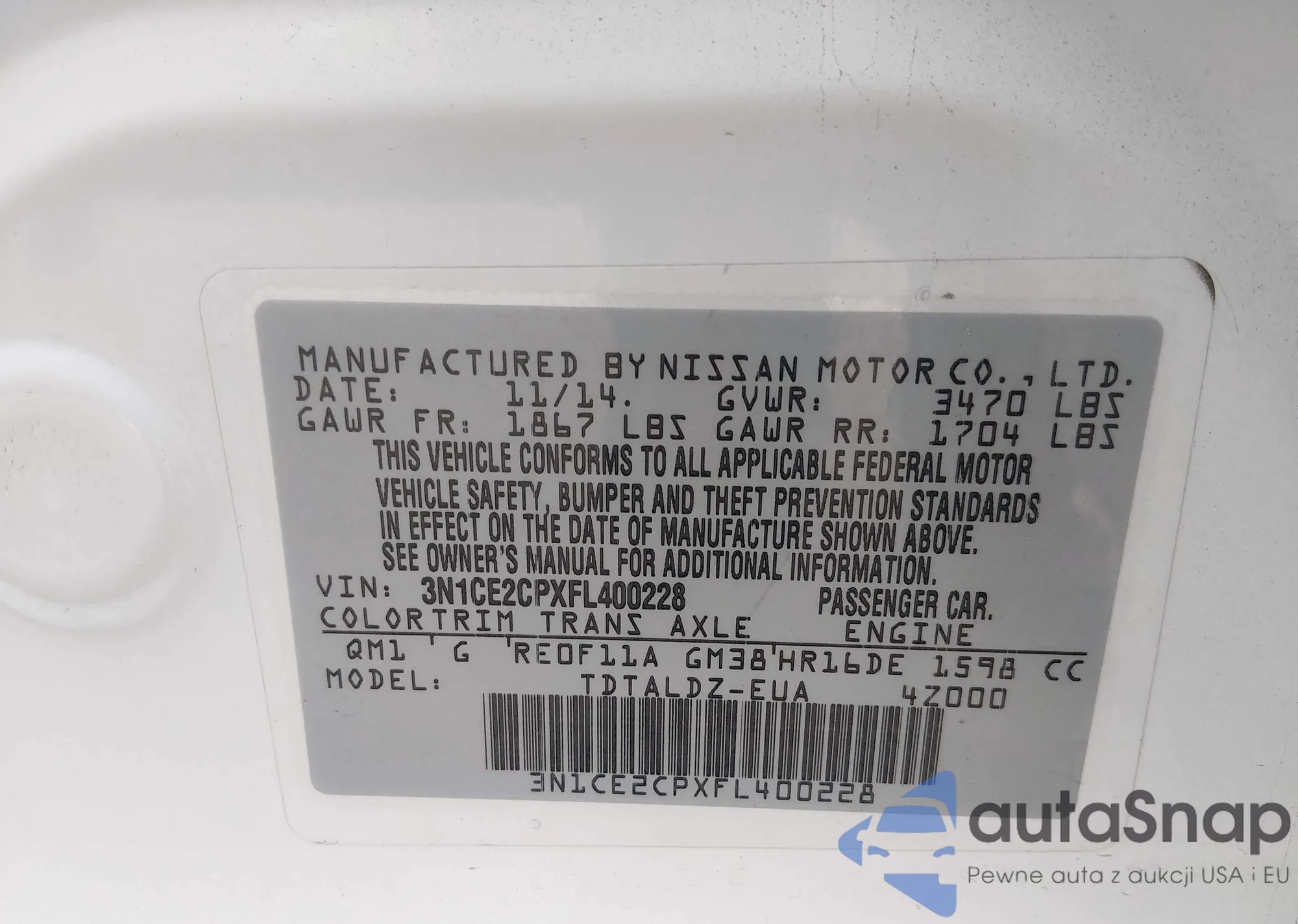 Samochód Nissan Versa 2015 (VIN 3N1CE2CPXFL400228) nie był wcześniej licytowany. Dokumenty są czyste, przebieg odpowiada lub jest niższy niż średnia rynku. Sprzedaje go firma ubezpieczeniowa – polecamy zakup. Dostawa do portu zajmie ok. 6–8 tygodni.