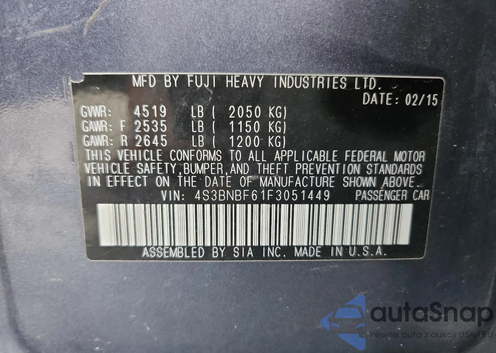 Samochód Subaru Legacy 2015 (VIN 4S3BNBF61F3051449) sprzedaje go niezweryfikowany sprzedawca. Zalecamy raport Carfax i potwierdzenie możliwości rejestracji pojazdu przed zakupem.