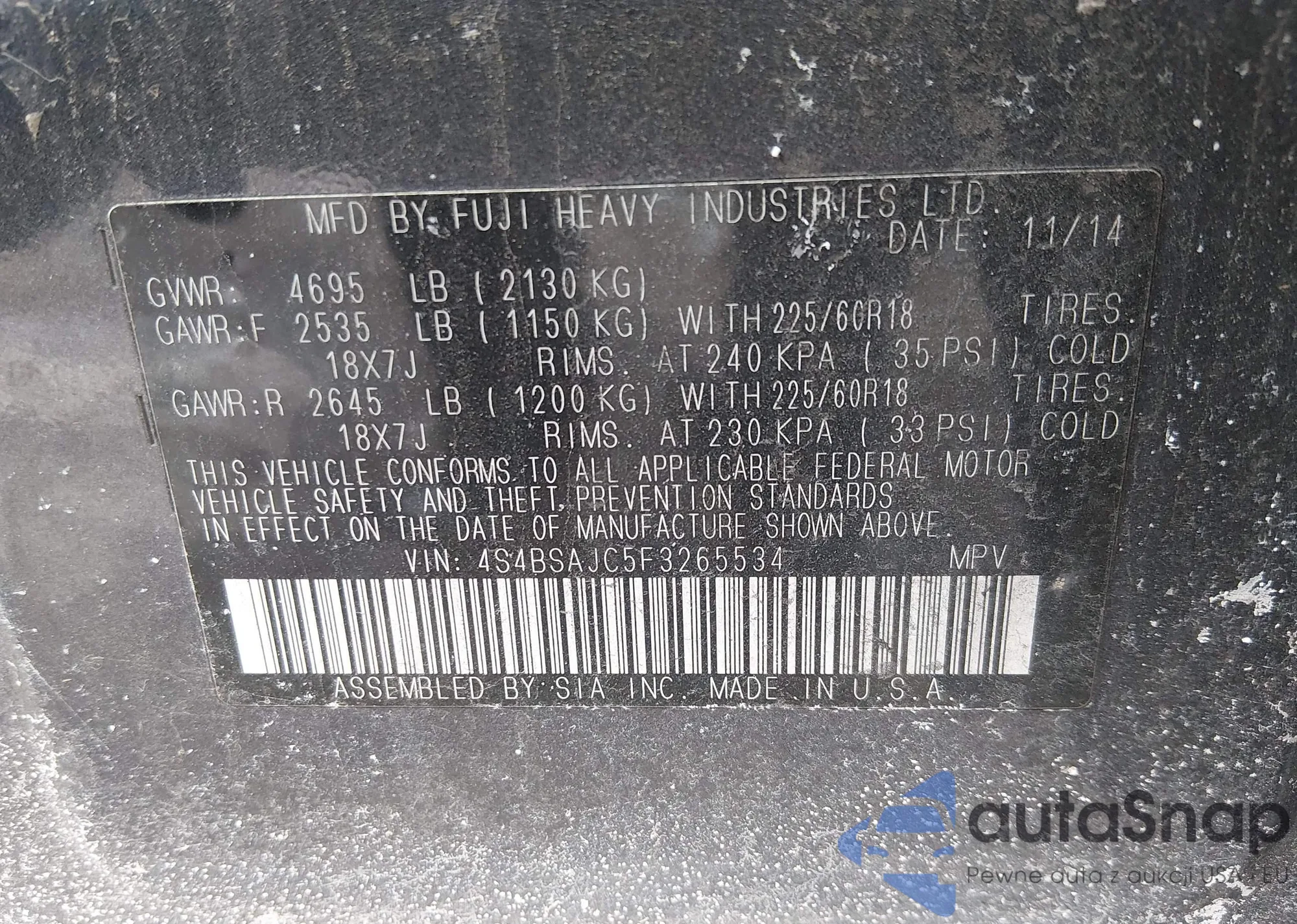 Samochód Subaru Outback 2015 (VIN 4S4BSAJC5F3265534) sprzedaje go niezweryfikowany sprzedawca. Zalecamy raport Carfax i potwierdzenie możliwości rejestracji pojazdu przed zakupem.